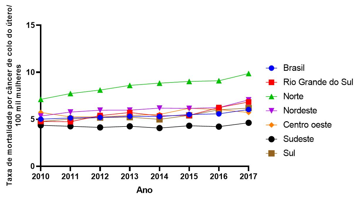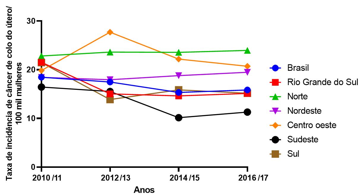 No presente estudo, verificou-se uma redução das estimativas de incidência do câncer de colo do útero no RS durante o período avaliado, bem como nas regiões Sudeste e Sul do país. Em contrapartida, as estimativas de incidência de câncer de colo do útero nas regiões Norte,