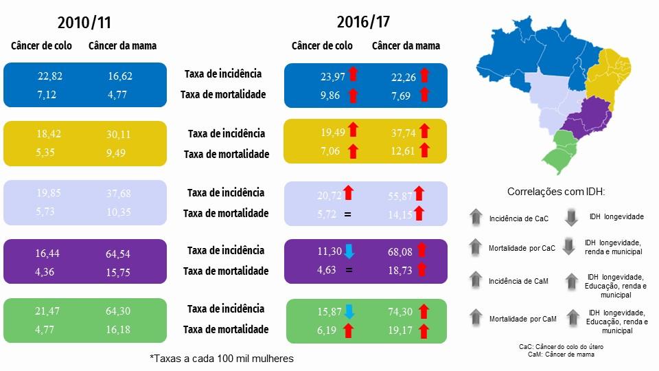 Este estudo avaliou as estimativas das taxas de incidência (TI) e de mortalidade (TM) dos 51 cânceres do colo do útero (CaC) e da mama (CaM) em regiões brasileiras entre os anos de 2010 52 e 2017 e correlacionou essas taxas às medidas do Índice de Desenvolvimento Humano (IDH).