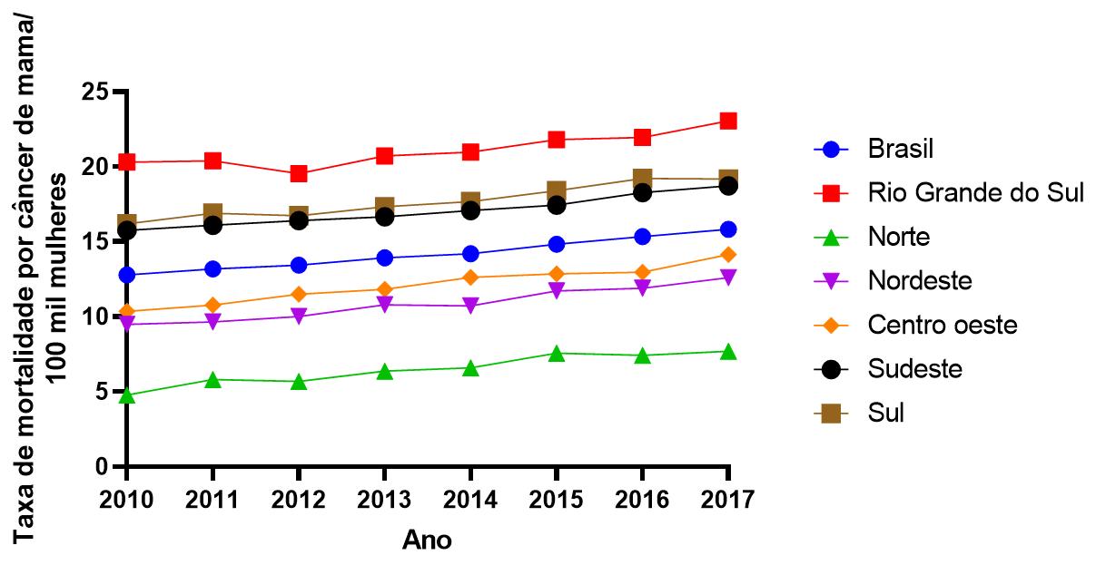 Taxas de mortalidade por Câncer de Mama no Brasil, nas macrorregiões brasileiras e no estado do Rio Grande do Sul por 100 mil mulheres durante 2010 – 2017