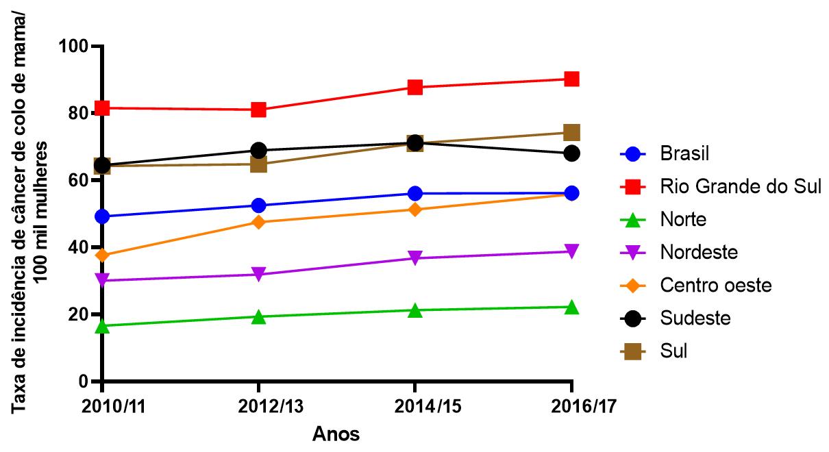 Estimativa das taxas de incidência de Câncer de Mama no Brasil, nas macrorregiões brasileiras e no estado do Rio Grande do Sul por 100 mil mulheres durante 2010 – 2017