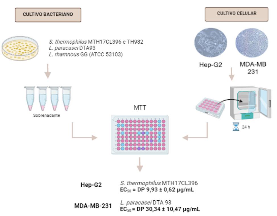 com propriedades probióticas em linhagens de células cancerígenas. As cepas utilizadas no presente estudo têm potencial tecnológico de acordo com estudos anteriores (TARRAH et al., 2018; VENDRAMIN et al., 2017). Sendo assim, estas cepas foram testadas para atividade citotóxica contra células de adenocarcinoma de mama MDA-MB-231 e carcinoma hepatocelular Hep-G2 usando Lactobacillus rhamnosus GG como cepa de referência. Os resultados demonstraram que alguns sobrenadantes das cepas probióticas utilizadas, foram significativamente citotóxicas para as células Hep-G2 [F(3,9) = 595,7], P < 0,0001. O sobrenadante de Streptococcus thermophilus MTH17CL396 teve um efeito citotóxico significativo (EC50 = 9,93 ± 0,62 μg/mL;) sobre o crescimento de células Hep-G2 em comparação com as mesmas células tratadas com o controle Lactobacillus rhamnosus GG (EC50 = 60,01 ± 0,24 µg/mL; P = 0,0006). Porém, quando comparamos as células tratadas com o sobrenadante de Streptococcus thermophilus TH982 com o controle, não observamos diferenças significativas na citotoxicidade (EC50 = 61,56 ± 2,90 µg/mL; P = 0,99). Além disso, neste presente estudo, o sobrenadante de Lactobacillus paracasei DTA 93 foi o que menos apresentou atividade citotóxica contra a linhagens de células Hep-G2 (EC50 = 350,5 ± 23,35 µg/mL; Tabela 1).