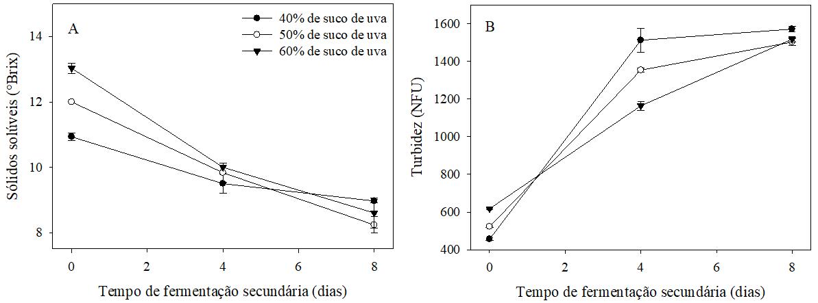 Ao longo da fermentação foi observado aumento na turbidez em todas as amostras com maior valor de turbidez em 8 dias. Destaca-se maior turbidez na amostra 40 e 50% de suco de uva, quando comparado a 60% de suco de uva em 4 dias de fermentação. Esse resultado pode ser explicado pois, uma elevada concentração de açucares pode reduzir a velocidade de crescimento da população microbiana e que o tipo de substrato pode influenciar no comportamento dos