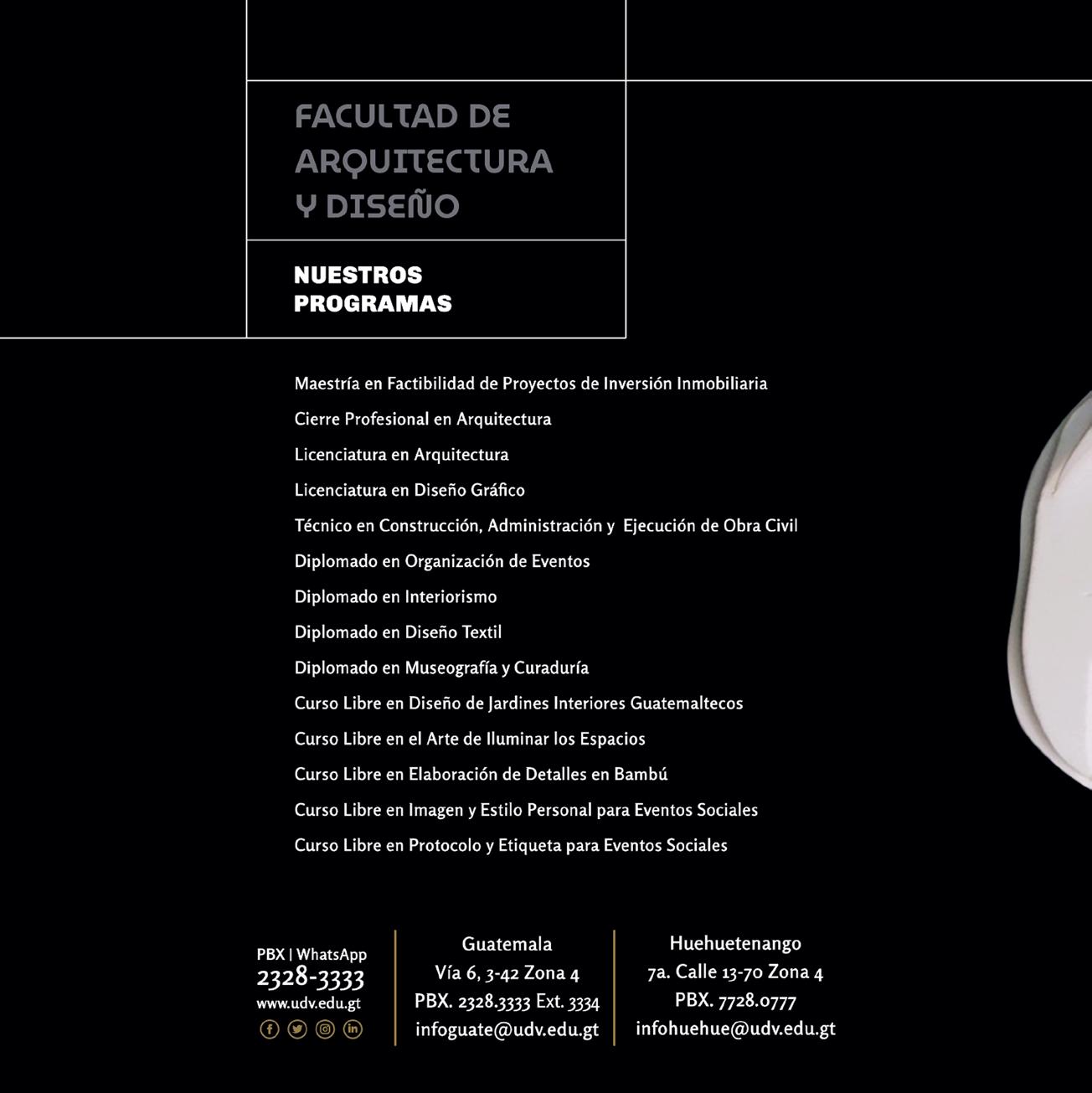 Editorial Historia de la Universidad y de la Facultad Diez años | El poder de crear un mejor futuro Lección inaugural Presentación de la Facultad de Arquitectura y Diseño Programas que ofrece la Facultad de Arquitectura y Diseño Convenios Escuelas de la Facultad de Arquitectura y Diseño • Escuela de Arquitectura • Escuela de Diseño • Escuela de Arte e Industrias Creativas Catedráticos nacionales e internacionales Alumni FARQ Universidad Da Vinci de Guatemala Fue autorizada el 02 de febrero de 2012 por resolución del Consejo de la Enseñanza Privada Superior -CEPS- quién aprobó unánimemente su proyecto educativo. « SaperVedere 7 8 10 12 17 18 20 21 22 28 38 44 46