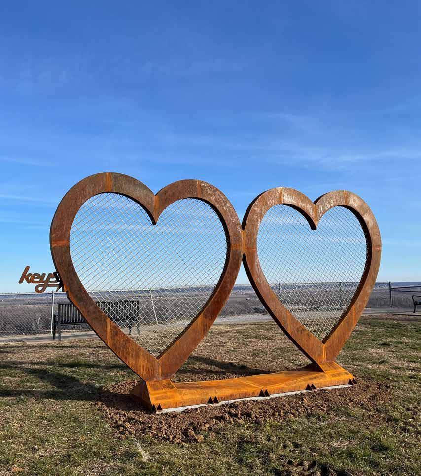 A double heart made of steel has been installed at Lover’s Leap as a way to keep a romantic tradition from ruining the fence at the park. Hannibal Parks and Recreation employees mounted the 10 foot-by-10-foot structure on a concrete pad at the 5-acre park located on a bluff above Route 79.