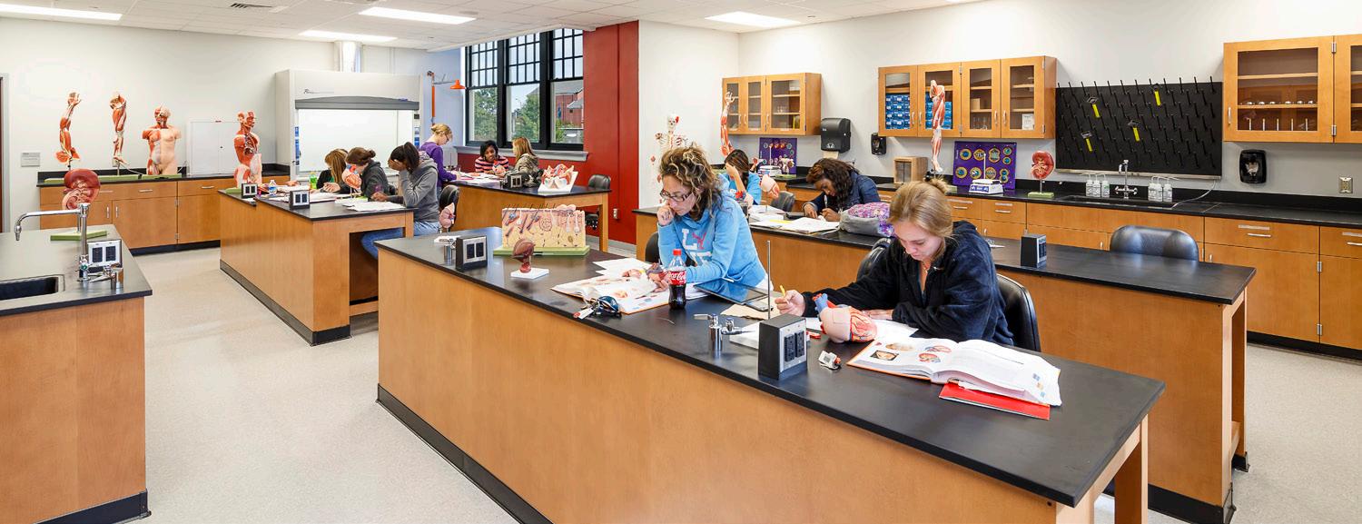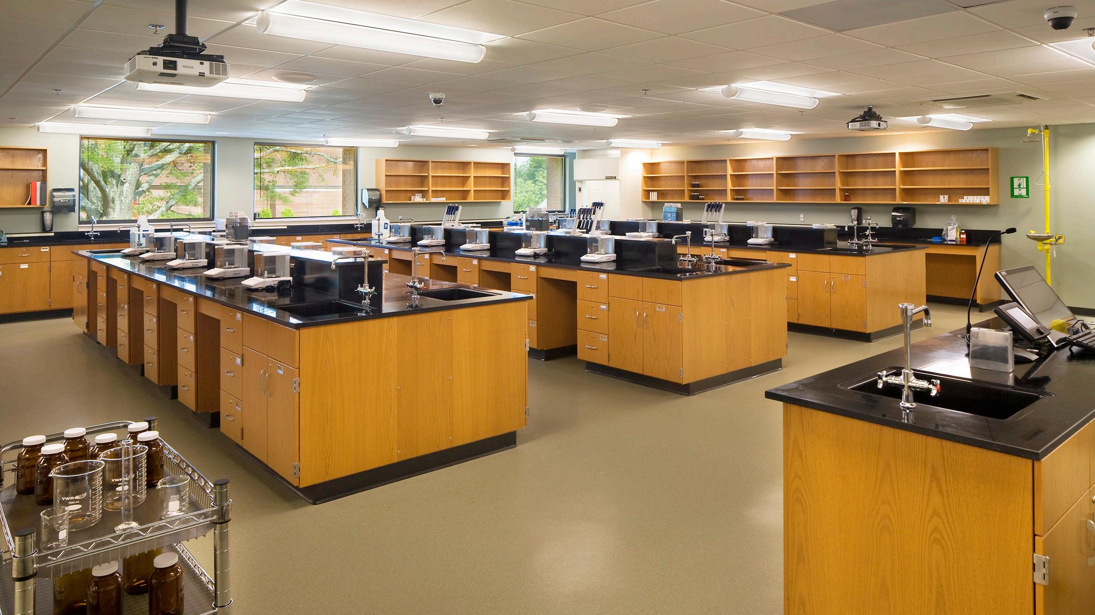 The new science building was designed to reflect the university’s new vision and master plan to create pedestrian-scaled developments with historically-based architecture to match existing traditional buildings across campus. Primary goals were to help strengthen and clarify the campus’s collective architectural fabric, while further establishing a palette that could serve as a foundation for future buildings. Programming includes: biology, microbiology, chemistry and physics labs and support spaces; classrooms and a computer lab; faculty offices; health promotion offices and advising space; and a student lounge. These disparate functions have been organized around a simple c-shaped plan which affords all corridors views directly outdoors, with seating at the ends. In addition daylight filters throughout the building and between labs and offices. Sustainable features of note include forty percent processed water reduction, and views throughout ninety percent of the space.