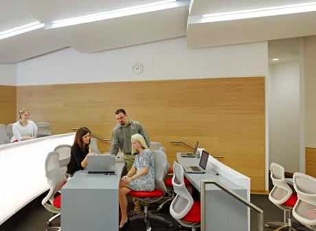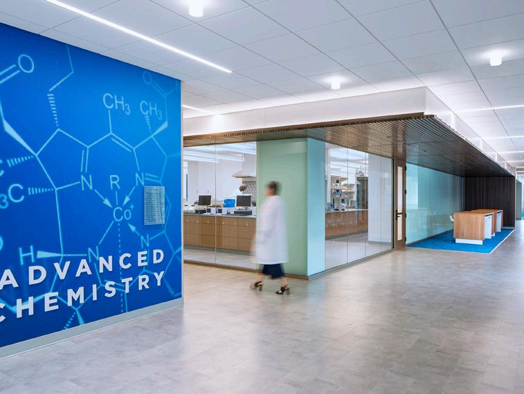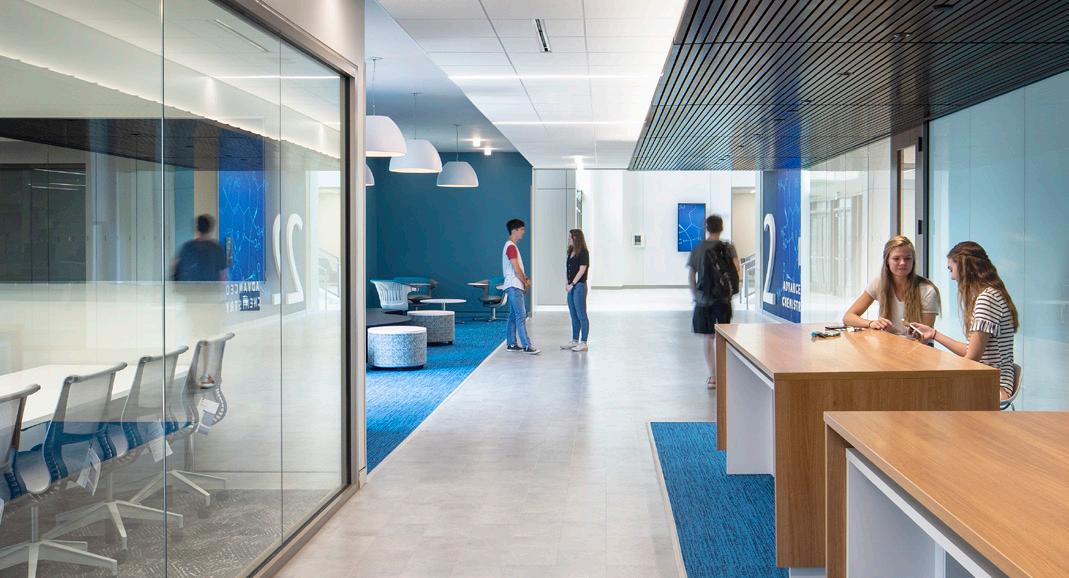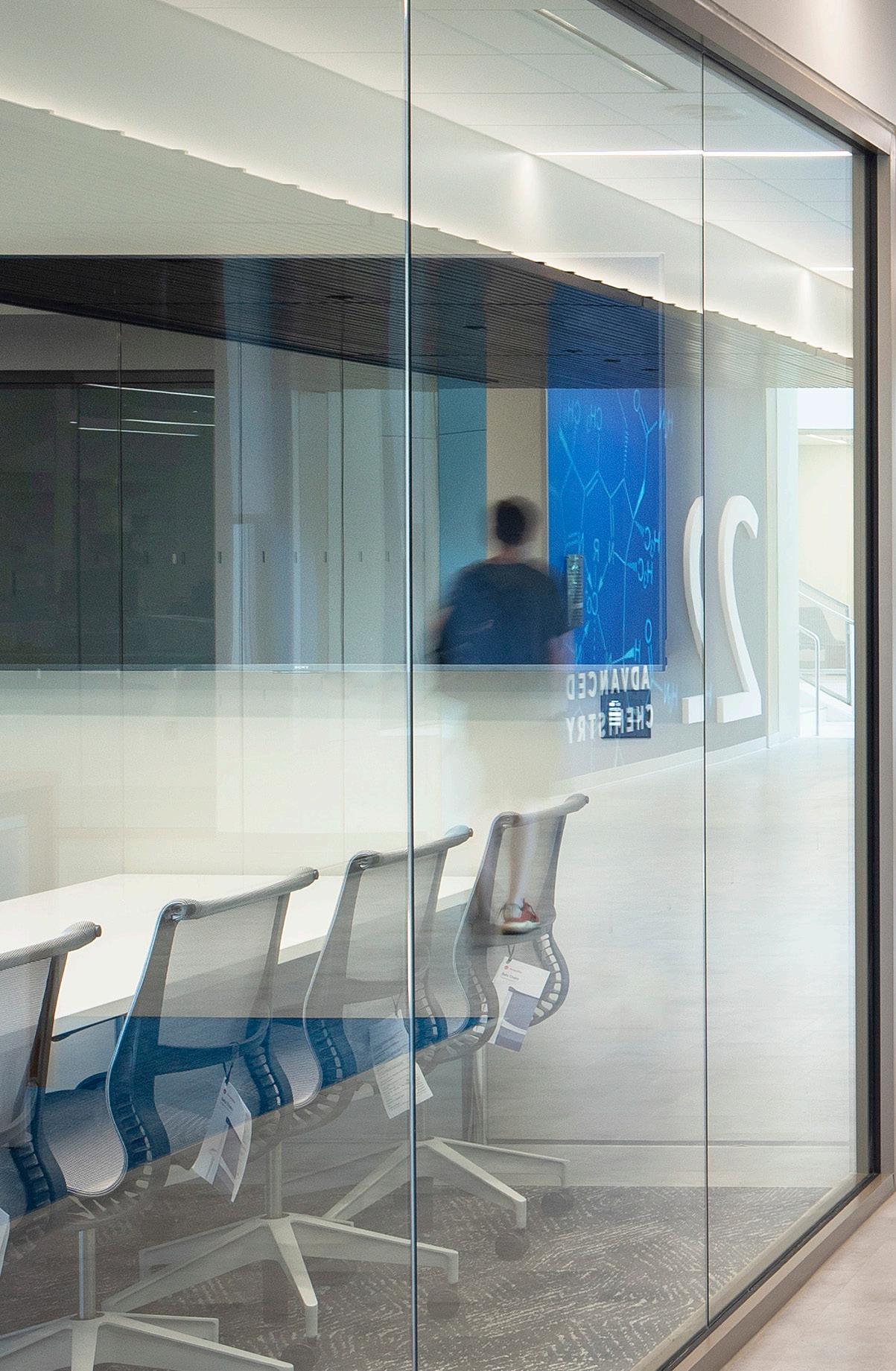 Built in 1974, the building was a windowless space in the west tower of the existing structure. By placing shared, public space along the perimeter and housing programmed spaces within broad expanses of glass, limited existing exterior glazing is optimized for daylight and views. This design strategy provides every classroom and lab with views outside. A three-story, glass- enclosed atrium replaces a former dark, one-story lobby and a monumental stair improves the connection and circulation. The result is three floors with 17 sustainable, state- of-the-art laboratories for honors chemistry, organic chemistry, general chemistry, and physical and analytical chemistry, fume hoods, and student lab stations, in an environment that puts safety and science on display.