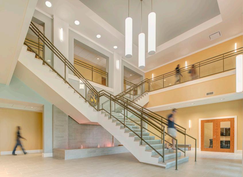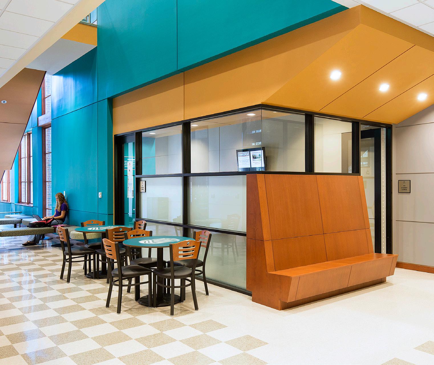 Our team successfully combined five different service areas under one roof to allow cost-savings through the sharing of functional space for offices, conference rooms, and meeting rooms. Two buildings with a connective breezeway combine the School of Nursing, School of Education, a Health and Wellness component, designed by Enwright Associates, and a bookstore with enrollment management services, prominently serving as the campus “front door” for students.
