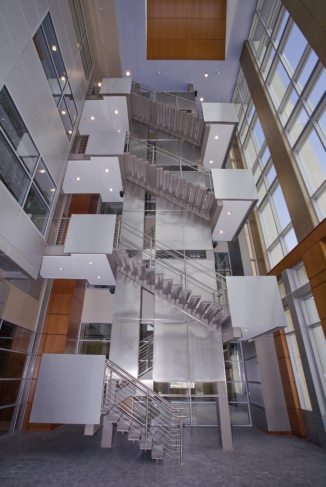An ultra-energy efficient building, the 55,000 square foot addition was conceived to accommodate expanding needs of the College of Architecture, Arts, and Humanities and intended as a teaching tool. Nearly 98% of regularly occupied space offers outside views, blurring the line between the natural world and the interior environment. This connection to the outside is enhanced with 24 skylights directing natural light into the double-height spaces, as well as operable and motorized windows which are opened when exterior conditions permit, allowing the mechanical systems to be shut off completely. Additionally, all interior finishes were selected to provide the highest standard of indoor air quality for this net zero energy building.
