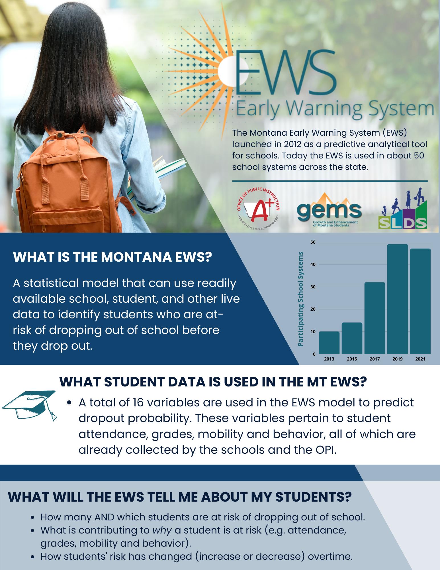 Theobjectiveof Montana?sStatewideLongitudinal DataSystem,GEMS,istopromoteandprovideasustainable systemtothepublic,stakeholders,leadersand researchersequippingdecision makingproceduresand evidence basedpracticestoimprovestudent outcomes GEMSandthesupport providedthrough GEMS(1) enhancestheMontanaOPI?sability toefficiently andaccurately manage,analyzeanduseeducationdata,(2) guidesdistricts,schoolsandeducatorstomakedata informeddecisionstoimprovestudent learningand outcomes,(3)supportsresearchtoincreasestudent achievement and closeachievement gaps,and(4)educates thepublicof thetrendsand patternssurroundingthesuccessof Montana?sstudents GEMSutilizesinteractive datavisualizationsandaccessibledatareportstorepresent theaccuratedatastoriesfor Montana?sschoolsand studentsover time ThedataandtoolsprovidedinGEMSarefurther supportedwiththedevelopment of training materialsandresourcestoensurethepublic,stakeholders,andleadershavethefoundational knowledgeto utilizethedata informingpotential of GEMS.
