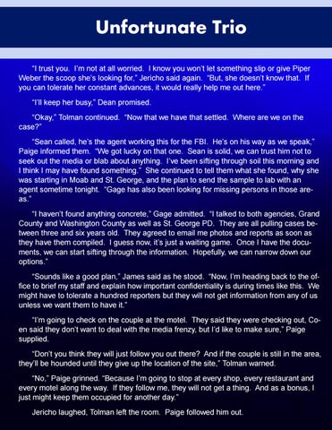 Unfortunate Trio “I trust you. I’m not at all worried. I know you won’t let something slip or give Piper Weber the scoop she’s looking for,” Jericho said again. “But, she doesn’t know that. If you can tolerate her constant advances, it would really help me out here.” “I’ll keep her busy,” Dean promised. “Okay,” Tolman continued. “Now that we have that settled. Where are we on the case?” “Sean called, he’s the agent working this for the FBI. He’s on his way as we speak,” Paige informed them. “We got lucky on that one. Sean is solid, we can trust him not to seek out the media or blab about anything. I’ve been sifting through soil this morning and I think I may have found something.” She continued to tell them what she found, why she was starting in Moab and St. George, and the plan to send the sample to lab with an agent sometime tonight. “Gage has also been looking for missing persons in those areas.” “I haven’t found anything concrete,” Gage admitted. “I talked to both agencies, Grand County and Washington County as well as St. George PD. They are all pulling cases between three and six years old. They agreed to email me photos and reports as soon as they have them compiled. I guess now, it’s just a waiting game. Once I have the documents, we can start sifting through the information. Hopefully, we can narrow down our options.” “Sounds like a good plan,” James said as he stood. “Now, I’m heading back to the office to brief my staff and explain how important confidentiality is during times like this. We might have to tolerate a hundred reporters but they will not get information from any of us unless we want them to have it.” “I’m going to check on the couple at the motel. They said they were checking out, Coen said they don’t want to deal with the media frenzy, but I’d like to make sure,” Paige supplied.