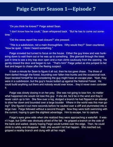 Paige Carter Season 1—Episode 7 “Do you think he knows?” Paige asked Sean. “I don’t know how he could,” Sean whispered back. “But he has to come out sometime.” “Did the news report the road closure?” she pressed. “This is a subdivision, not a main thoroughfare. Why would they?” Sean countered. “Now be quiet. I think I heard something.” Paige scowled but turned to focus on the house. Either the guy knew and was hunkering down to wait them out or he was up to something. She glanced through the trees just in time to see a tiny trap door open and a man climb cautiously from the opening. He gently closed the door and began to run. “That’s him!” Paige yelled as she jumped to her feet and began to chase after the fleeing suspect. It took a minute for Sean to figure it all out, then he too gave chase. The three of them darted through the forest, bounding over fallen tree trunks and the occasional rock. Sean berated himself for not considering the guy might have an escape plan. Yeah, they were in a subdivision, but the guy’s house butted up against the National Forest. He could build anything out there and nobody would ever know... they’d never even consider it.