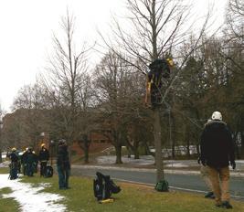 Using simple rope access equipment and techniques gives arborists an ideal work position to make the best pruning cuts. Young lindens often require several courses of reduction pruning cuts to slow the growth of large temporary branches and codominant leaders.