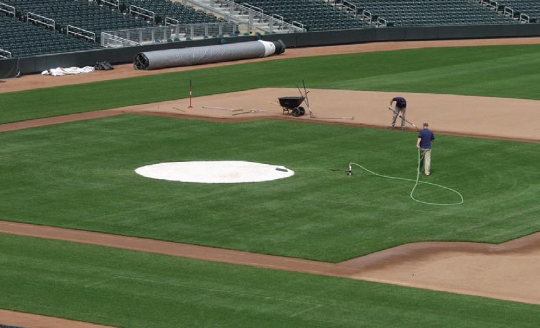Maintenance Program: The maintenance program begins early season fertilization with weed preventative. Aeration is performed at a minimum of three times per year. High wear areas are seeded frequently. Edging of the infield is performed throughout the season with a more intensive approach in September. A thorough mound renovation is performed every September. The high wear area in front of the mound is re-done in September. Re-grading of the infield skin is performed in September with additional Ag-Lime added as needed.