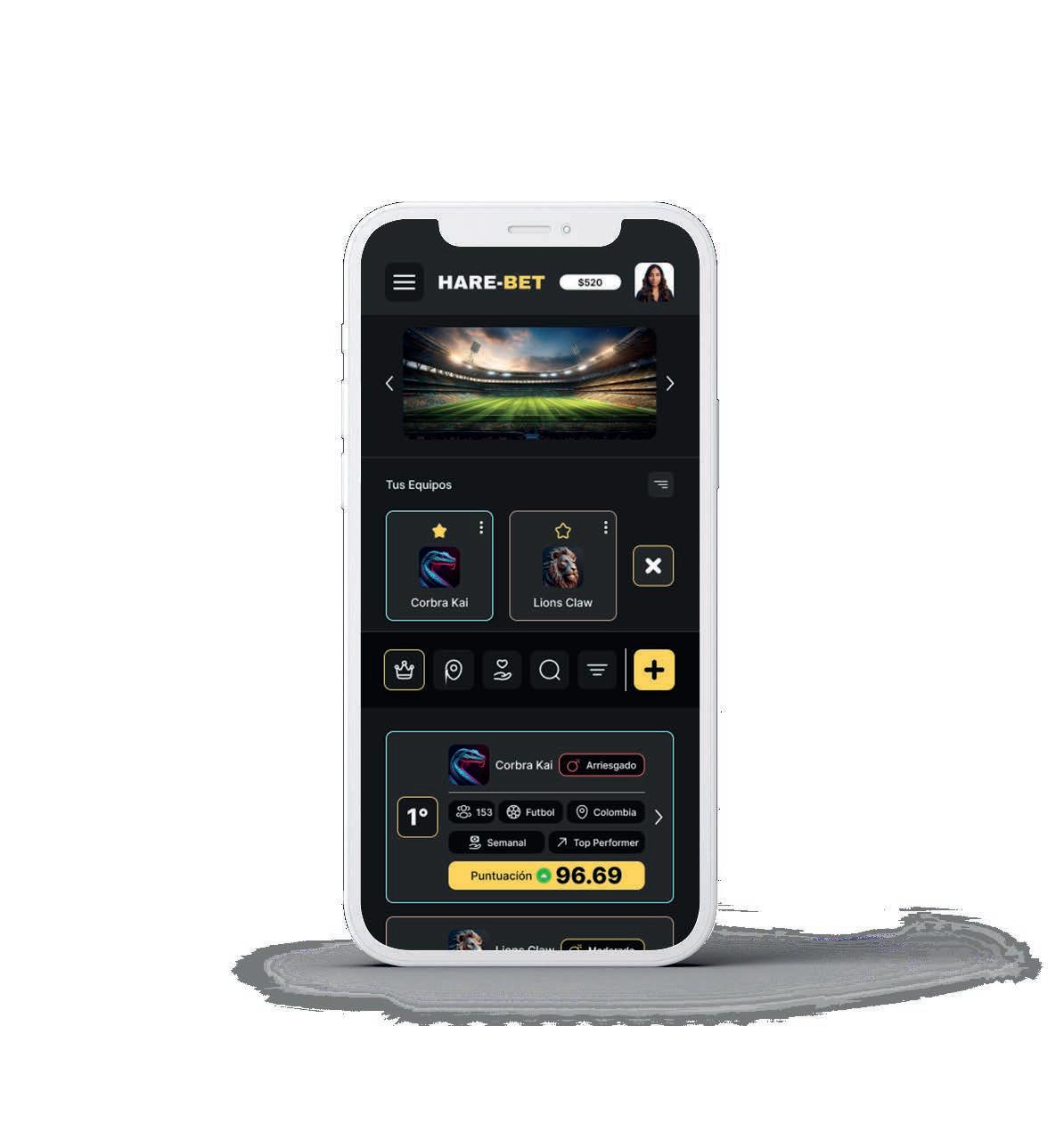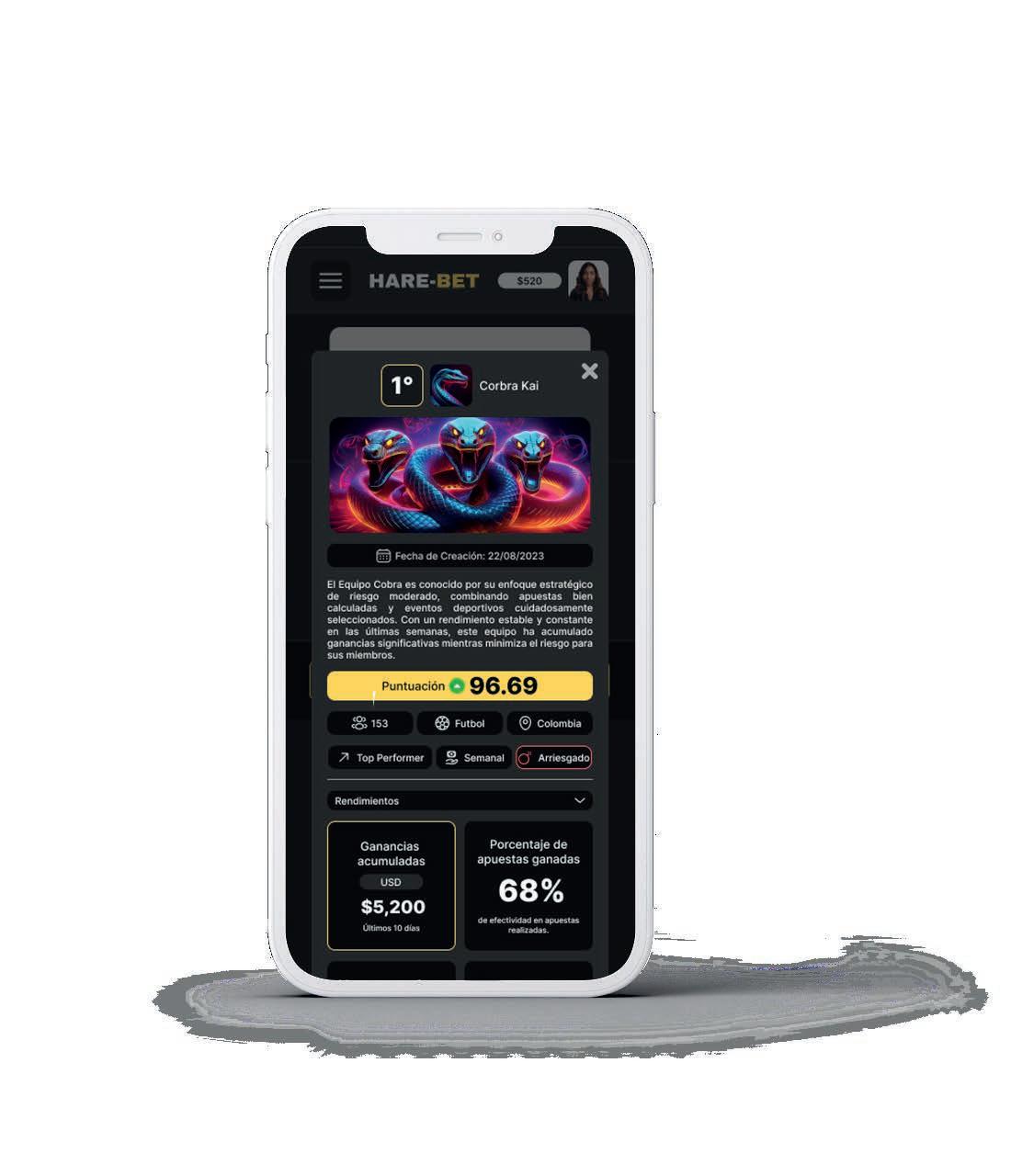 App de apuestas con enfoque grupal para fomentar retención y estrategias colaborativas. Diseño oscuro y dinámico que prioriza opciones claras.