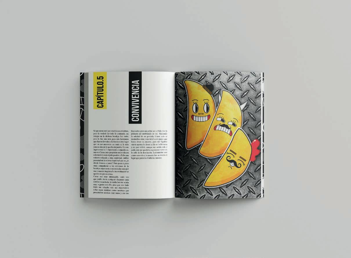 Libro escrito, ilustrado y diseñado como una sátira cómica y trágica. Concepto absurdo que enfatiza lo gracioso y fuera de contexto.