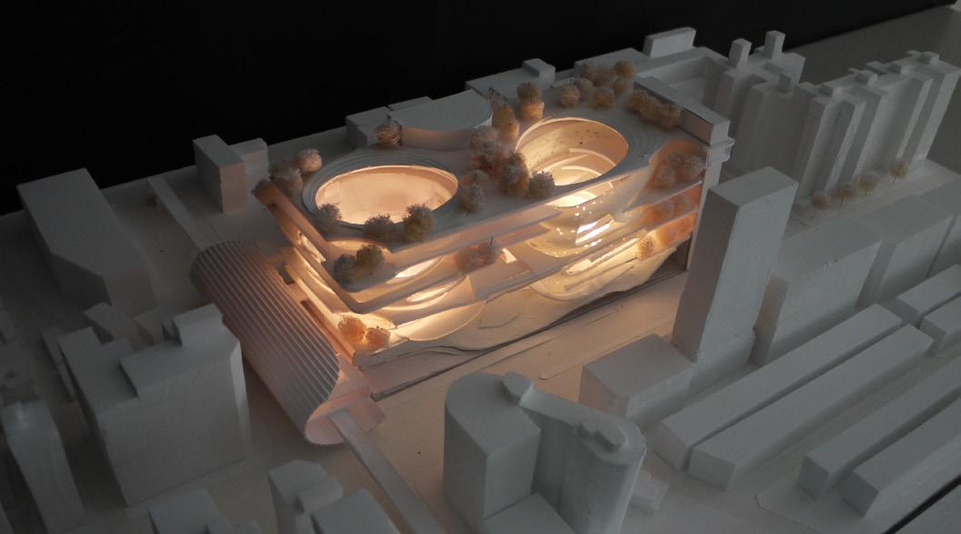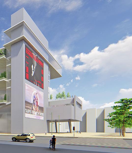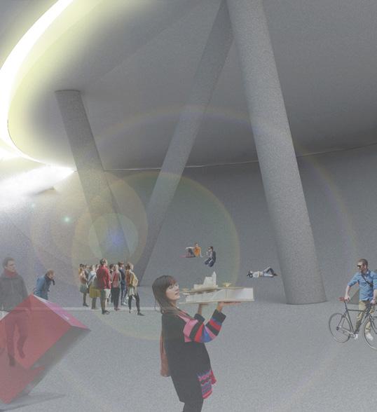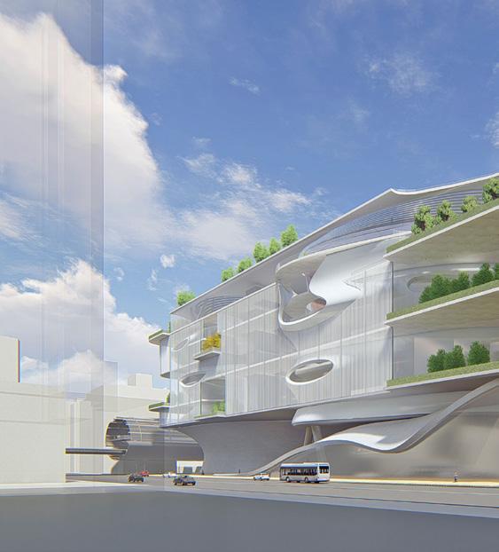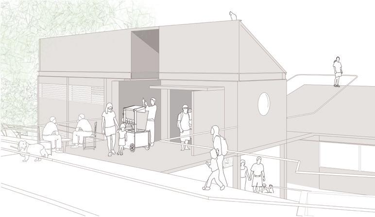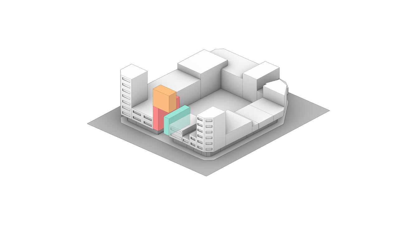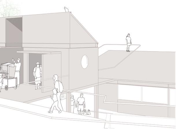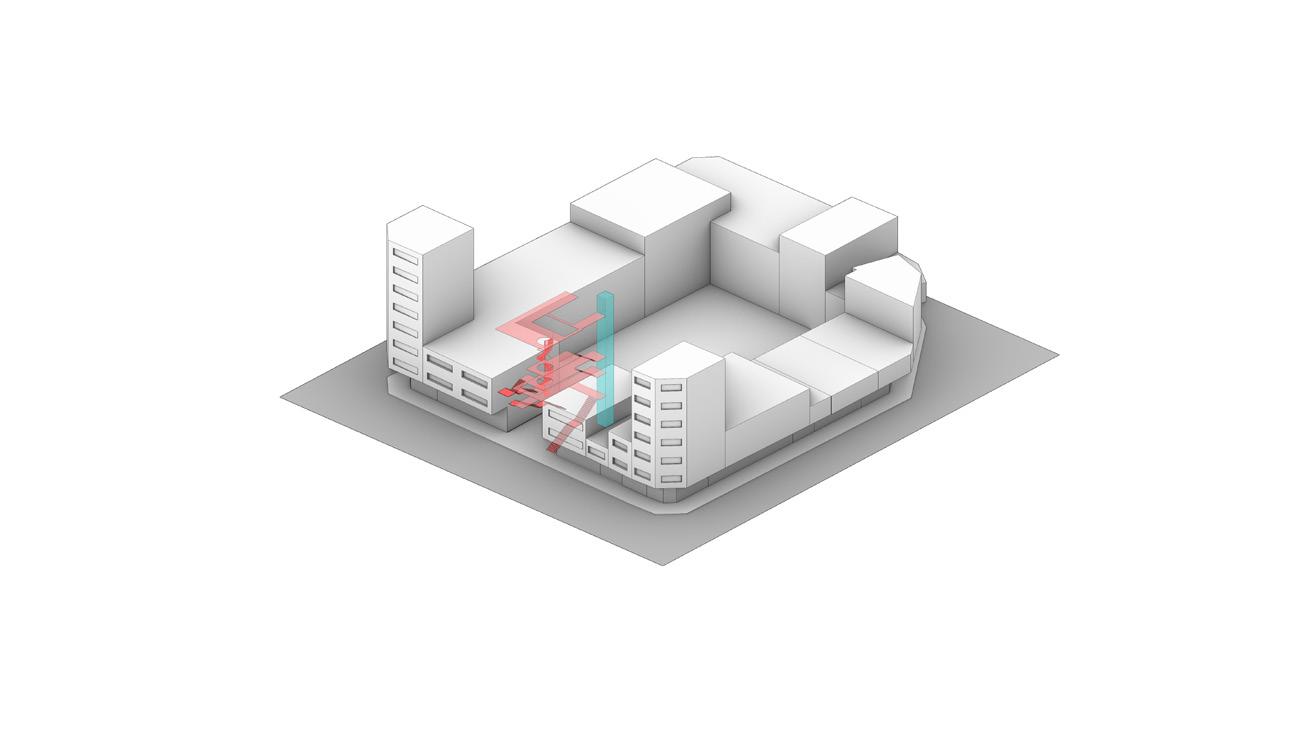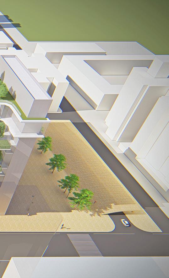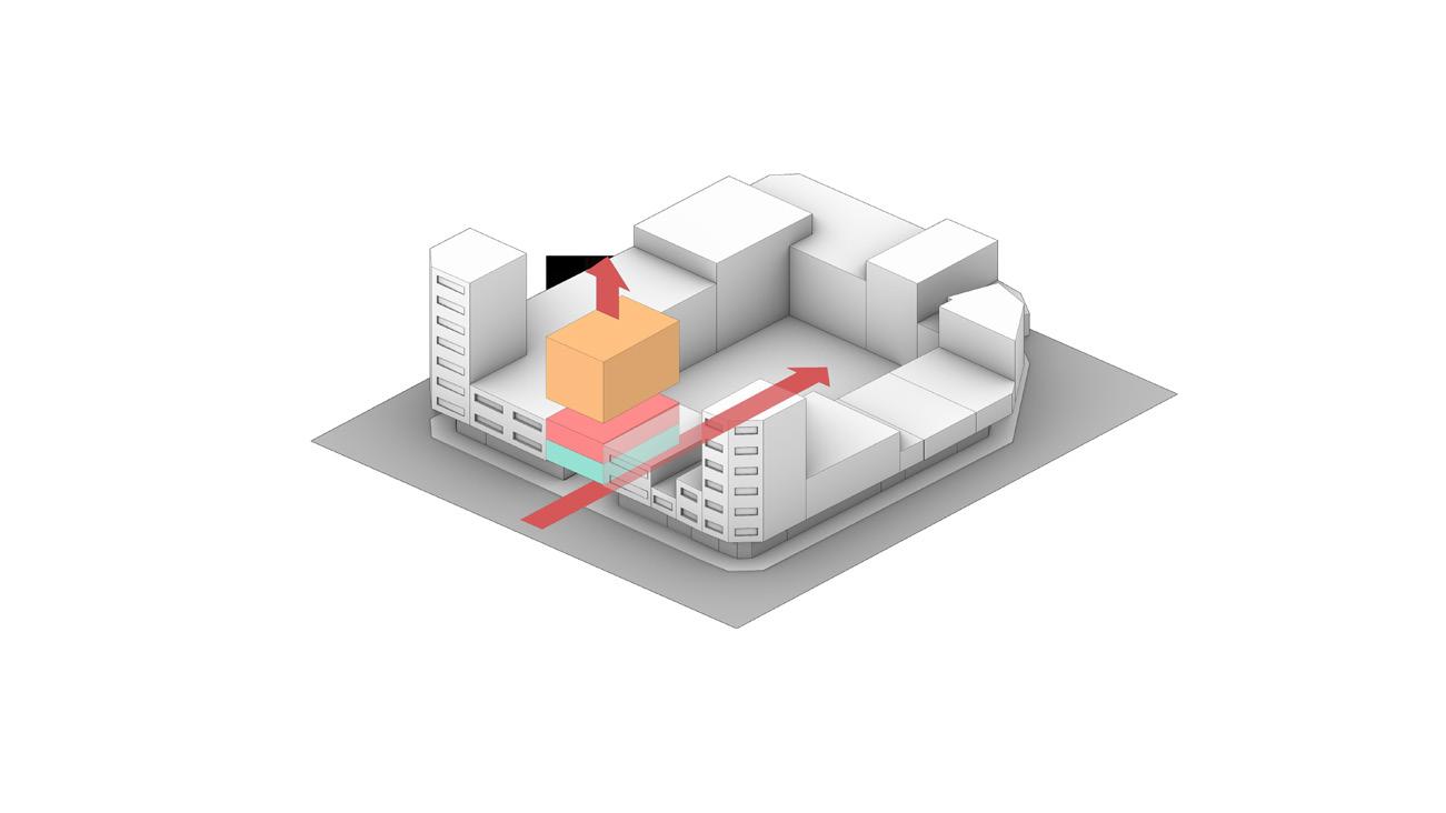 value of street life. The proposed architectural design reimagines an elevated ground floor that serves as a new entry point, drawing pedestrians' attention toward the district's central area. Moreover, the building's central portion is hollowed out to form a courtyard, maximizing sunlight exposure and fostering an inviting, open space. Instead of conventional ground-floor amenities, a wide staircase replaces the former programs, guiding visitors to the upper levels.
