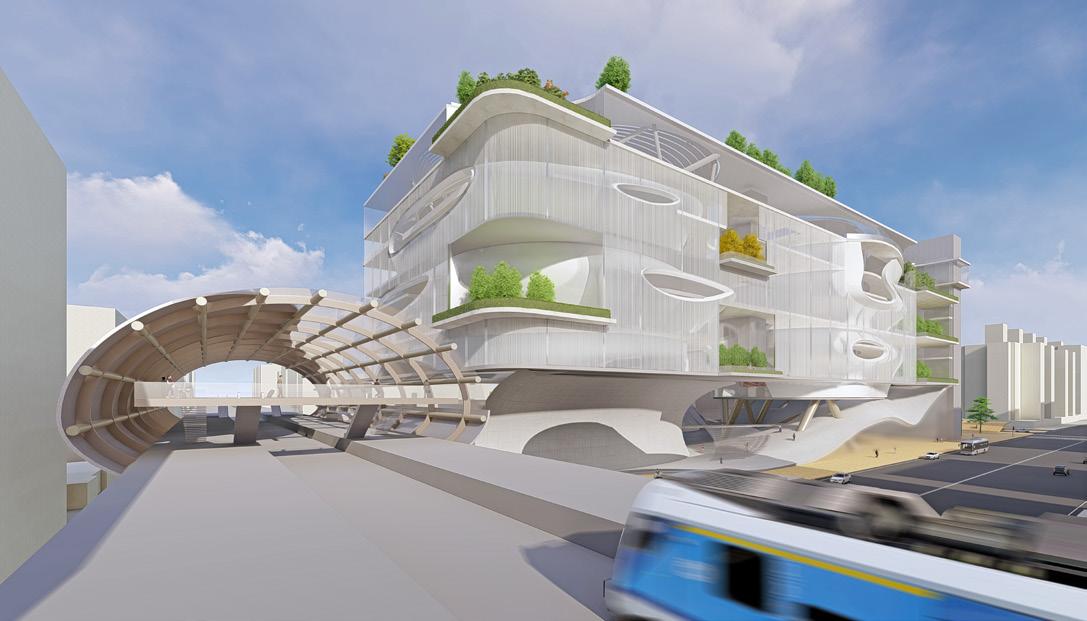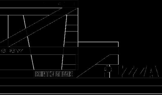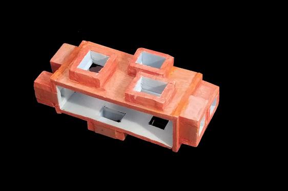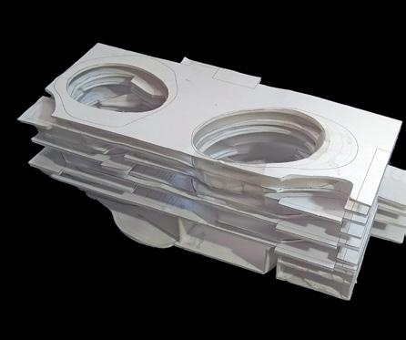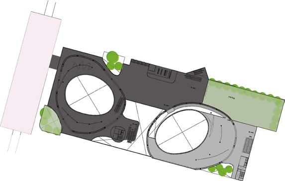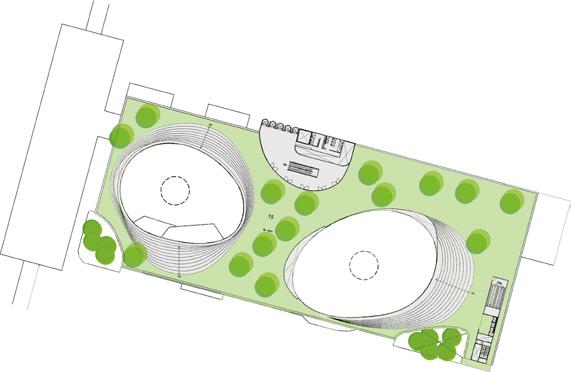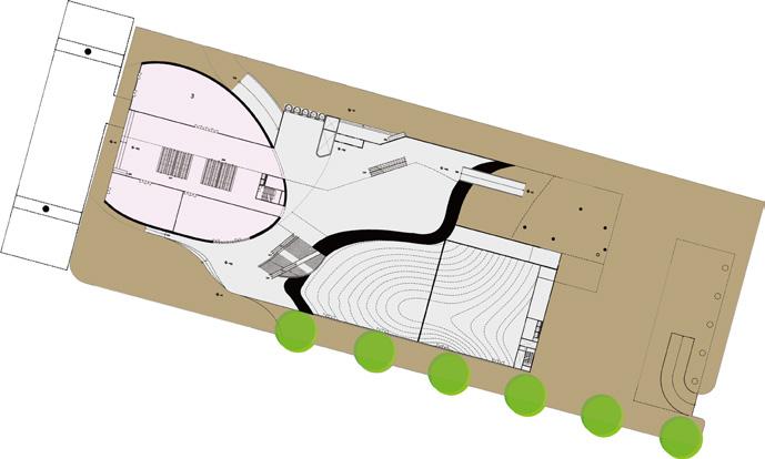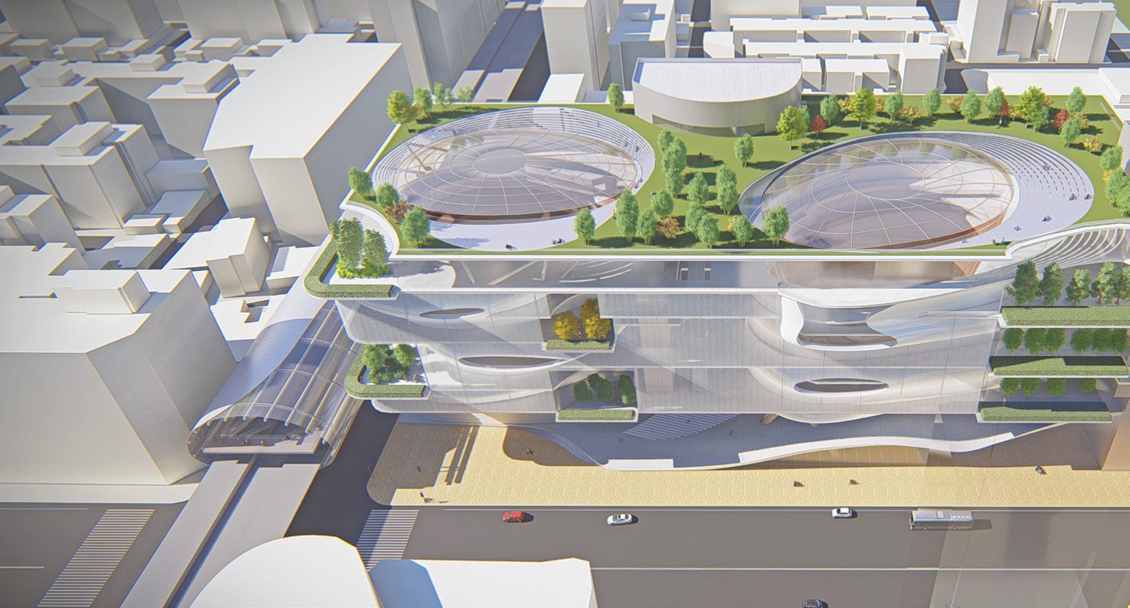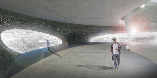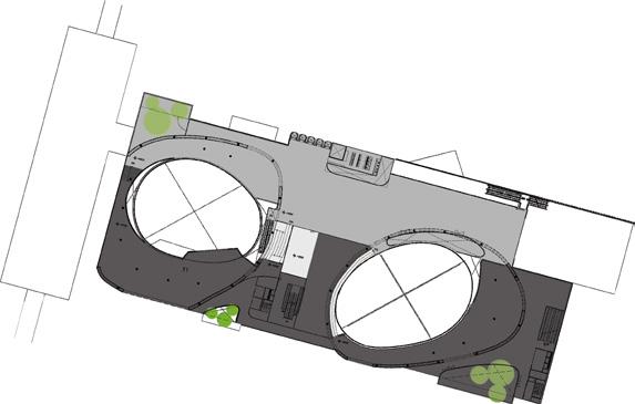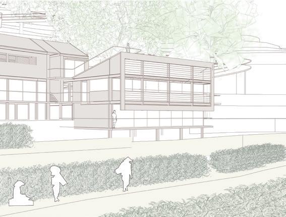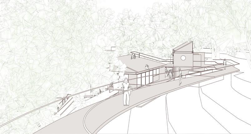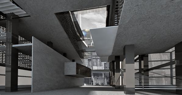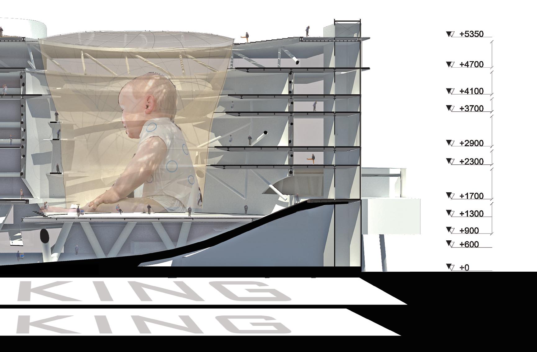value of street life. The proposed architectural design reimagines an elevated ground floor that serves as a new entry point, drawing pedestrians' attention toward the district's central area. Moreover, the building's central portion is hollowed out to form a courtyard, maximizing sunlight exposure and fostering an inviting, open space. Instead of conventional ground-floor amenities, a wide staircase replaces the former programs, guiding visitors to the upper levels.