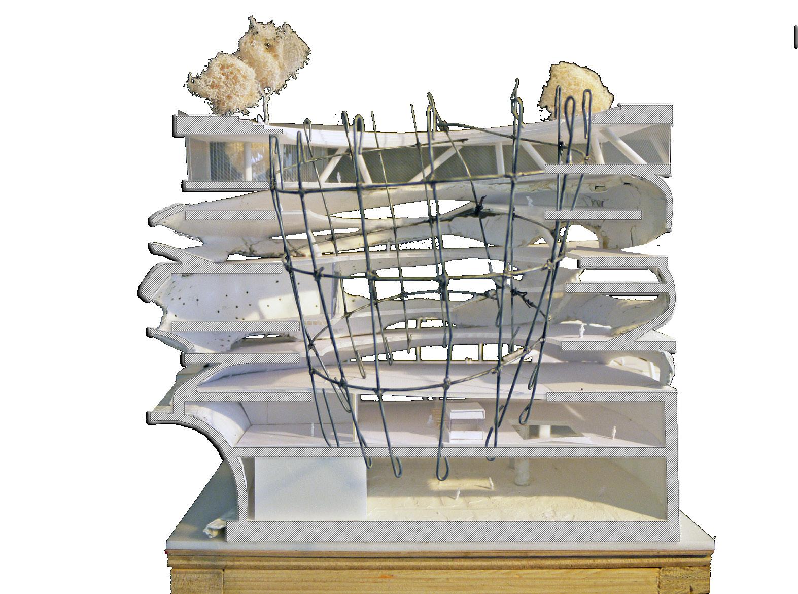 This design responds to the concept of "unexpected encounter." Through the spatial layout, people can inadvertently intersperse, discover, and interact with the people or objects in the maze. Due to the instability of the cableway system, the installation begins to have a visual representation changing with the wind, light, and events. When people vaguely see the objects before them, this may motivate them to explore the unknown region.