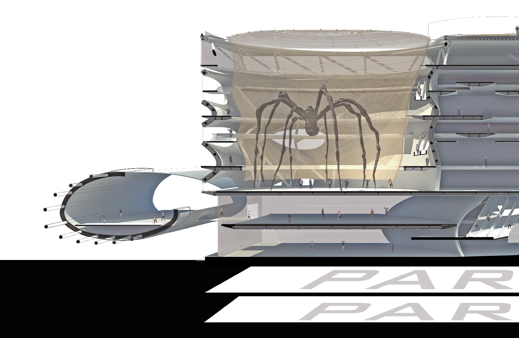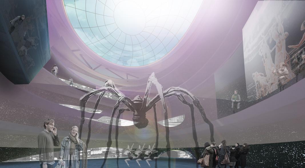 In the 2015 competition, our project was chosen as the winner. The project developed utilized the eastwest region and museum entrance, consisting of three pentagonal columns measuring 7-8m in height and five triangular columns at 3-4m in height, arranged in the center. These objects were connected with steel cables that hung papers of various sizes to create a maze-like spatial arrangement.