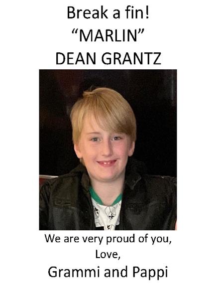 DEAN GRANTZ (MARLIN) A fourth grader at University Park in Gateway, Dean is excited to be back at Mon River Arts! He has previously been seen in the ensemble for Oliver at MRA, Bruce Bogtrotter in Matilda Jr at Premier Performing Arts, a Wickersham Brother in Seussical, Jr. at Theatre Factory, Ed Molar in Sally Cotter and the Censored Stone, Ensemble in Pinkalicious at GCT, Ensemble in Honk, Jr. at PPA and The Big Bad Wolf in Shrek, Jr. at the Threatre Factory. He loves to play video games, takes acting classes at MRA, sings in the All Star Choir and is in the gifted program at school. He also loves to volunteer at his church, Monroeville United Methodist.