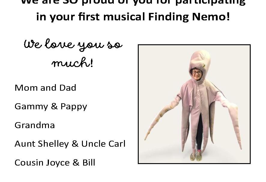 Chloe Blank- Good luck Chloe! I love you! Gabby and Abby…Break a leg Chloe! We are so proud of you! Love Mom and Dad…So excited Chloe Blank for your hard work in Finding Nemo, Jr! Good luck. We are so proud!!!Love you! Grandma Laurie and Pap Jeff…To our wonderful, talented granddaughter Chloe Blank- Break a leg! Love Gram and Pap Blank… Good luck to my best girl Chloe, you are going to do amazing and I am so proud of you! Have the best time and break a leg, I love you- Aunt Ana…To the best Sheldon, Seahorse 2, Vacationer, and Sea Turtle the world ever did see! Br eak a leg Chloe Blank. I love you, Aunt Missy.