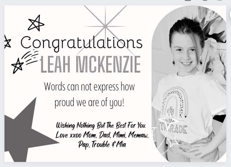 Leah Morgan- Leah, you have always been a shining star to us. Love you forever, Memaw & Pap…Leah, a wonderful young lady has made it to "A STAR IS BORN". Love you, Fred…Leah you make me so proud. You're my shining star. Love you, Mimi…Leah, we LOVE to see your EXCITEMENT when it comes to theater. It never gets old seeing you up on that stage. XO, Proud Mom & Dad