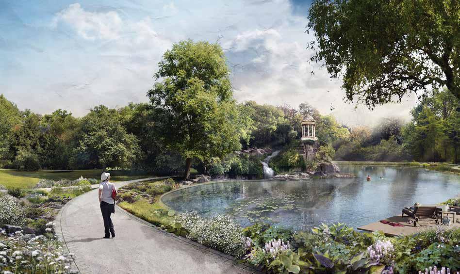 créer des promenades dans le « style paysager » classique, déployées entre lisières et clairières. Le point d’orgue de ce projet est la remise en eau du lac. Cette pièce d’eau de près de 2 000 m² deviendra le cœur battant du Domaine, où le spa puisera son inspiration. Le jardin alpin sera recréé comme autrefois, tandis que L’Orangerie offrira une vue splendide sur le médaillon central. En bordure du lac, La Folie promet une expérience inédite au sein de la Cité des Sacres.