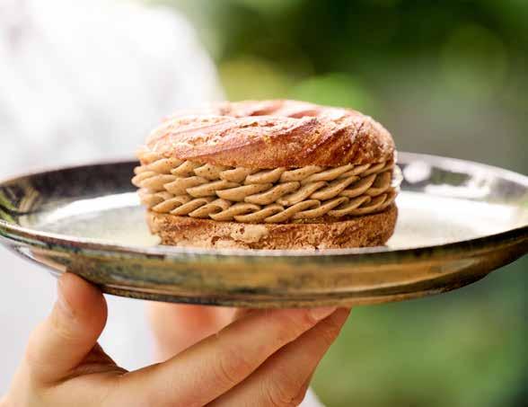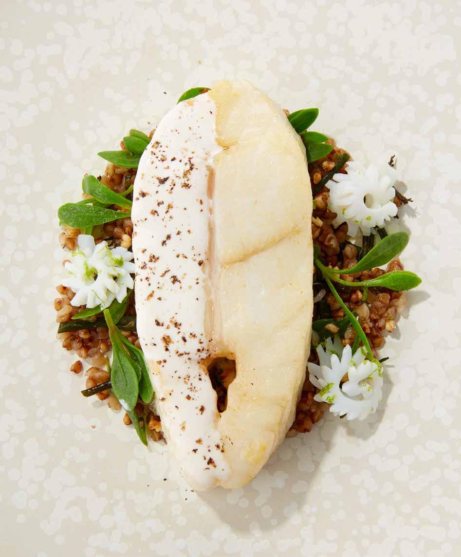 Ingrédients (4 pers.) : 1 petite butternut, 180 g de châtaignes (100 g pour le velouté + 80 g pour la garniture), 1 l de lait, mélange d’épices (muscade, girofle, gingembre, poivre), caviar Baerii polonais Le Comptoir du Caviar, crème entière, sarrasin grillé, cerfeuil, piment d’Espelette. Dans une casserole, faites fondre le beurre. Ajoutez l’ail et l’oignon hachés et laissez-les suer pendant 3 min. Incorporez les châtaignes et la chair de butternut coupée en morceaux et faites revenir. Versez le lait, les épices et le gros sel. Portez à ébullition, puis laissez mijoter à feu doux pendant 25 min, à demi couvert. Étalez le sarrasin sur une plaque et enfournez 10 min à 150 °C pour le rendre croquant. Dans une poêle, dorez le reste des châtaignes concassées avec une petite noix de beurre. Réservez. Mixez les légumes avec un peu de liquide de cuisson pour obtenir une texture veloutée et lisse, puis montez la crème bien froide en chantilly salée. Enfin, versez le velouté chaud dans des bols. Saupoudrez de châtaignes et de sarrasin et terminez par une cuillère de crème fouettée, décorée d’une quenelle de caviar Baerii.