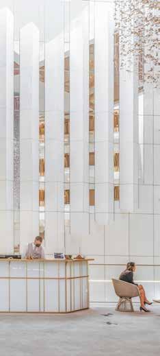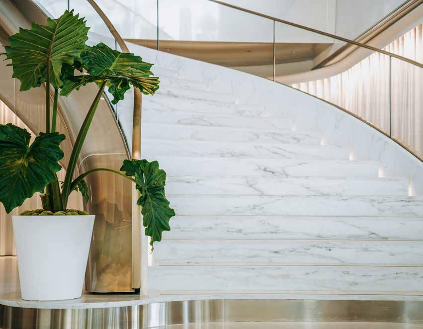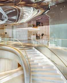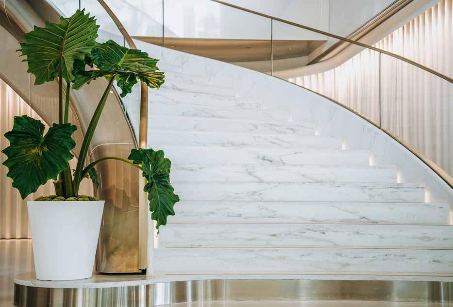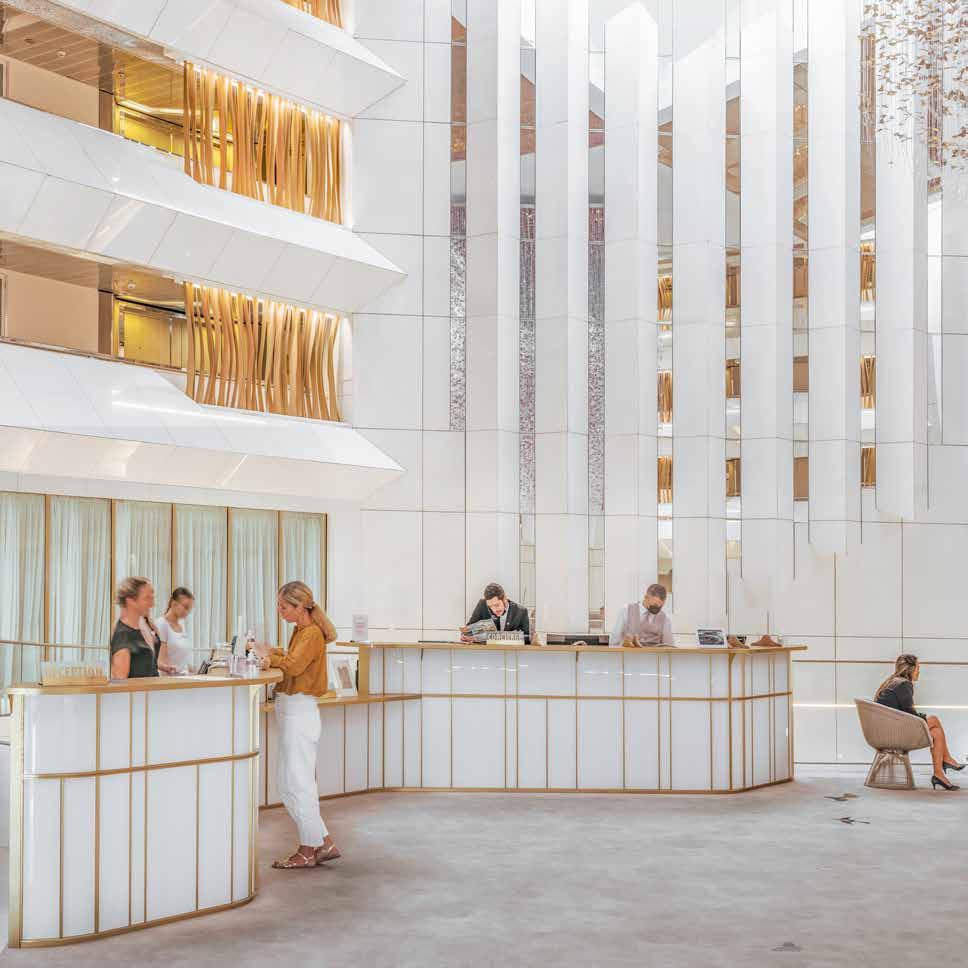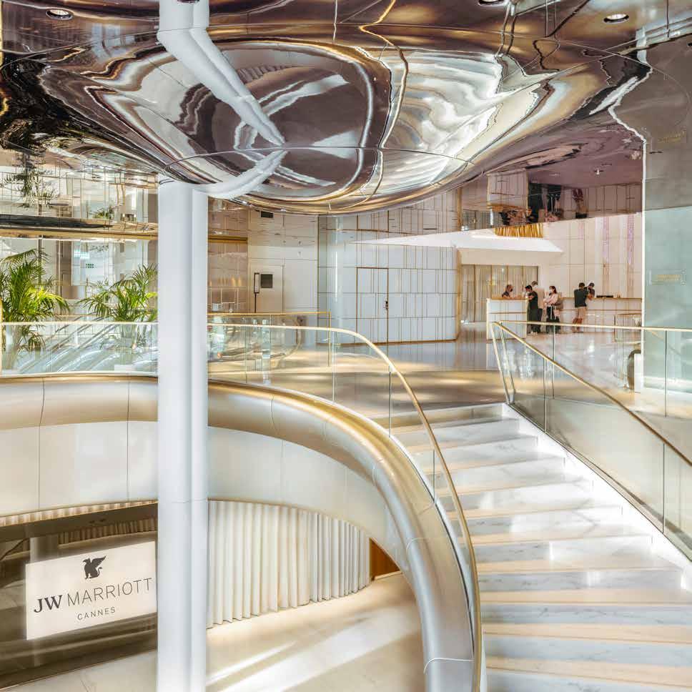 Capturant l’énergie vibrante de la lumière, la façade du JW Marriott Cannes se présente comme une abstraction vivante, grâce à ses vitres courbées qui s’intègrent harmonieusement dans le paysage urbain. Au sommet, sa corniche en verre – revêtue de corian – se fond au parement blanc de l’hôtel. Un écrin végétal couronne également l’édifice, invitant la nature à s’immiscer. À l’intérieur, le mobilier de prestige signé Knoll et Minotti, et les créations textiles imaginées par Christian Lacroix, embellissent l’ensemble. En réfléchissant les abords de l’hôtel, les plafonds laqués créent une illusion d’harmonie et de continuité avec l’extérieur. Le bleu Méditerranée, au-dessus de l’escalier monumental, intensifie les reflets. La coque de la passerelle, semblable à un navire flottant dans l’atrium, arbore une couleur champagne, dont la teinte claire et irisée illumine l’espace de restauration de son éclairage zénithal. Les sols, quant à eux, s’habillent de marbre Calacatta Gold – un matériau noble et durable – et dont les veines dorées rappellent élégamment le sable blond des plages de la grande bleue. Sublimée par les talents de l’agence Moatti-Rivière, l’architecture incarne l’esprit glamour et chic de l’hôtel, qui a su, au fil des ans, séduire les plus grands noms du 7e art.