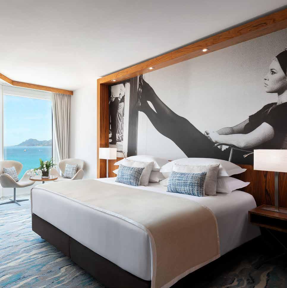 Preserving the authenticity of this iconic address, the JW Marriott Cannes is inspired by the magic that built its renown. On six floors, the 262 rooms, including about 50 suites, pay tribute to the hotel’s cinematographic heritage in portraits of celebrities, immersing guests in the glamour of the Cannes Film Festival. Brigitte Bardot, Catherine Deneuve and Jean-Paul Belmondo above the bed heads, with leather embellishing the walls for a very effective touch of ‘‘couture’’. The hotel’s deep fondness for the Côte d’Azur is also visible in the choice of azure-blue carpets recalling Mediterranean waves. Bathed in daylight thanks to large windows, the rooms combine modern comfort with panoramic views of the town and sea. Immaculate in Calacatta marble from floors to walls, the bathrooms offer decidedly contemporary design.