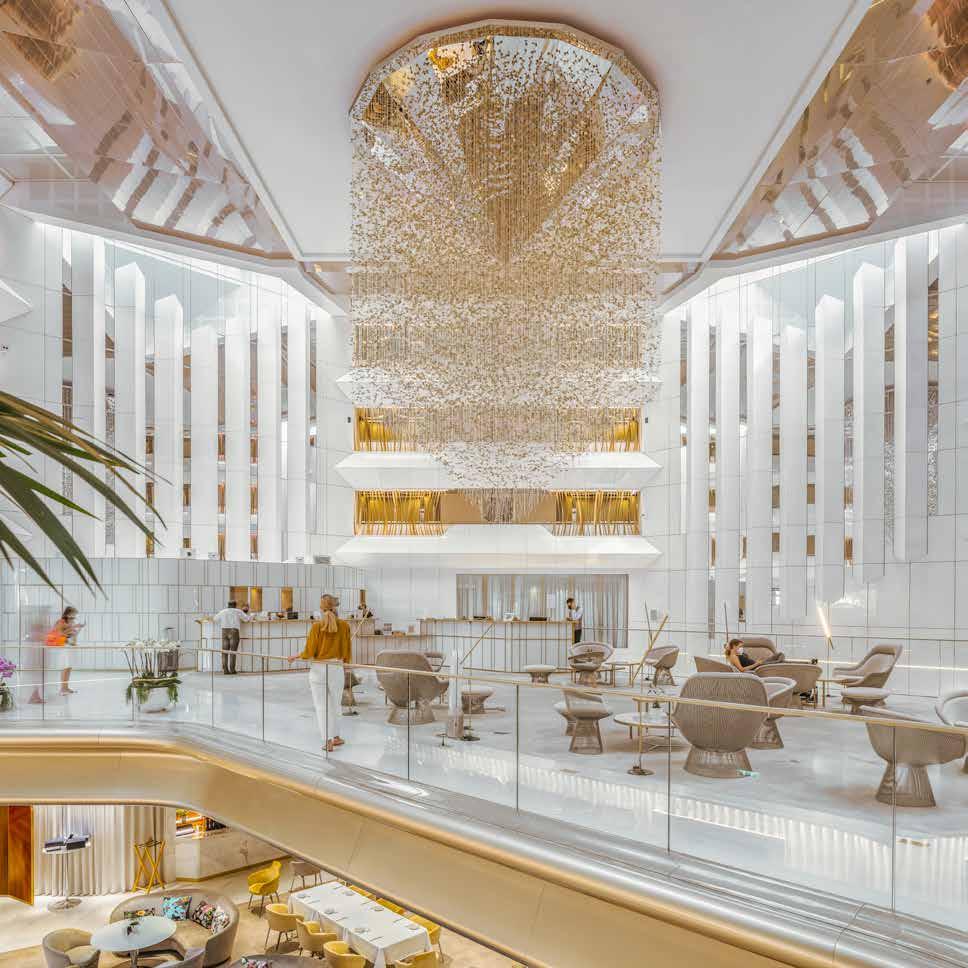 LIKE A DIAMOND, THE CHANDELIER IN THE JW MARRIOTT CANNES UNFURLS THOUSANDS OF THREADS ADORNED WITH BOWTIE MOTIFS RECALLING THE FESTIVAL STEPS.
