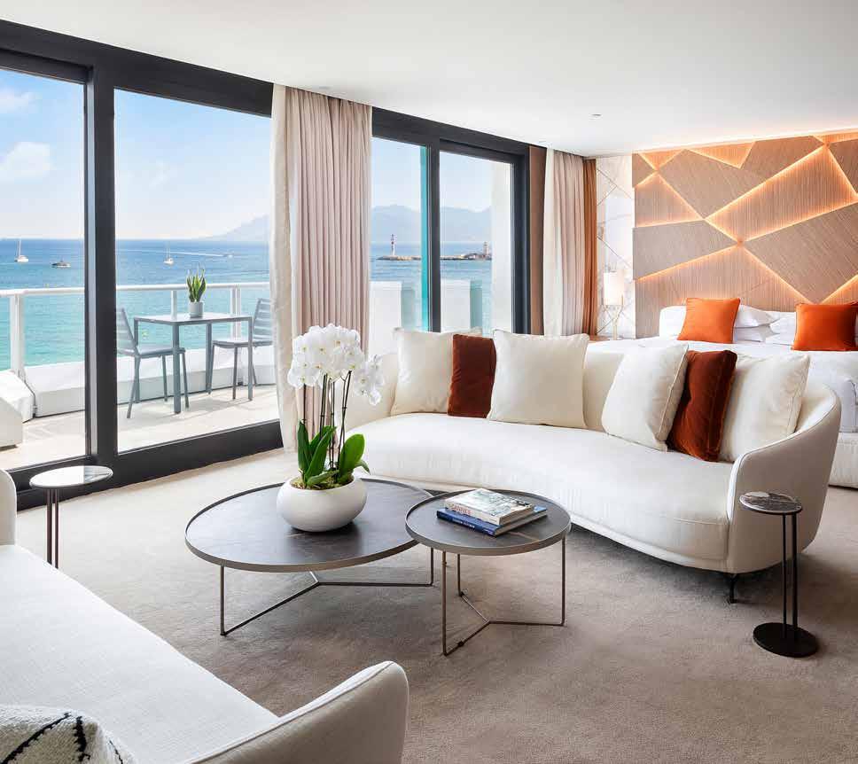 Ce n’est qu’en 1988 que le bâtiment mythique est transformé en hôtel par l’architecte Michel Delattre. Clin d’œil à la magie du cinéma, un théâtre de 820 places – Théâtre Croisette – est installé au sous-sol. Plusieurs propriétaires et marques se succèdent ; du Noga Hilton au Palais Stéphanie avant de devenir l’actuel JW Marriott. Sous la houlette de l’architecte Alain Moatti et son équipe, dont la designer d’intérieur Marie-Pierre Guérin, l’établissement cinq étoiles s’offre une cure de jouvence en 2021. Une façade stylisée, un lobby restructuré, de nouvelles boutiques de luxe, un casino, un bar à champagne, un restaurant italien, une plage privée, une terrasse panoramique, un centre de conférence, sans oublier les 262 chambres, pimpées et décorées sur le thème du 7e art… Le JW Marriott sort le grand jeu ! Avec un service de qualité du plus haut niveau, cet écrin haute couture redéfinit l’excellence, offrant à ses hôtes une expérience où le luxe embrasse un design des plus modernes, tout en conservant l’aura glamour des années 1950.