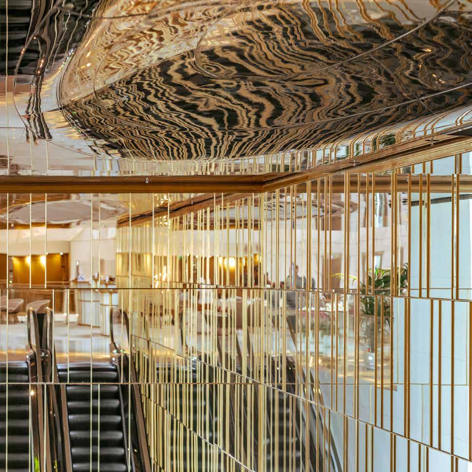 Sous le magistral atrium, une passerelle suspendue accueille le lobby. Dès le seuil franchi, le regard est happé par cet incroyable lustre et ses motifs en forme de nœud papillon, dont les rayons du soleil se reflètent tout au long de la journée. Redimensionné pour la création de cette « high line », il n’a rien perdu de sa superbe. En toile de fond, une vue panoramique sur la grande bleue, tout aussi saisissante. Inondé de lumière, le lobby a éclipsé le faste traditionnel au profit d’une élégance contemporaine. Les murs s’habillent de marbre italien Calacatta Lincoln, réchauffés par la dorure des balustrades, qui s’élèvent en une succession de coursives périphériques. En son cœur, la réception se pare d’une décoration chic et sobre, où les lignes épurées et les volumes se répondent. Agencés avec soin, des fauteuils et des tables ultra design composent un salon lounge, invitant les visiteurs à la détente et à la contemplation. Cette nouvelle configuration, avec le restaurant Scalini et le bar en contrebas, offre une vue plongeante sur l’effervescence de l’hôtel, tout en conservant un sentiment d’intimité. Avec son entrée en scène remarquée, le lobby confirme cette première impression : épatant !