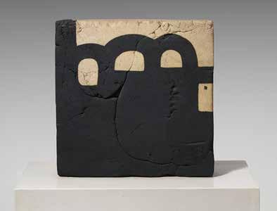 1. Lucio Fontana, Crocefissione 1954-56. Terre cuite engobée, peinte et cuite trois fois en noir, rouge, blanc, jaune et or, 47 x 35 x 9 cm. Courtesy Tornabuoni Art. Engobed terracotta, painted and third-fired black, red, white, yellow, and gold.