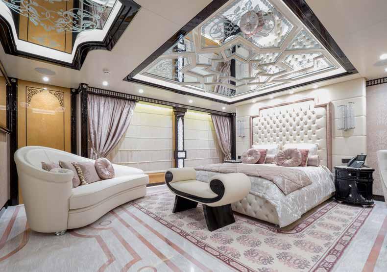 beam owner’s cabin astern, the VIP cabin forward, flooded with light through the skylight formed by the glass floor of the walkway to the forward lounge area, and two double cabins, providing accommodation for a total of 8 guests. The crew quarters (2 cabins - 3 beds) are amidships and accessed via a dedicated walkway on the side of the superstructure. Regarding the engines, owner can decide whether to install a pair of MAN V12 1800 for a top speed of 29 knots or two MAN V12 1900 engines that drive the yacht to a top speed of about 31 knots.