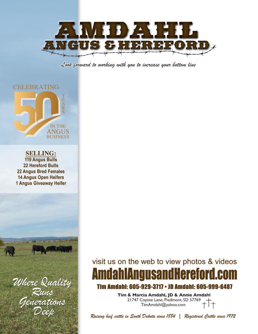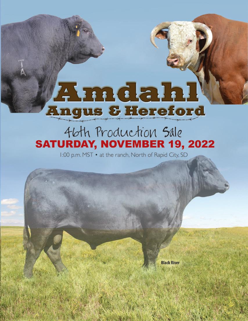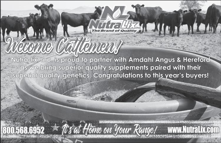 Amdahl Angus & Hereford Annual Sale28 BW: 81 Adj. WW: 767 WWR: 98 +108 +1.02 +23 YW SC Milk +3 +1.6 +66 CED BW WW DOC $W $B +16 +60 +133 BD: 1/23/22 Reg No: 20406041 Tattoo: 2125 Lot 84 AMDAHL ROCKETEER 2125 AMDAHL’S ROCKETEER 636 MUSGRAVE AVIATOR KOUPALS B&B IDENTITY G A R PROPHET MCATL FOREVER LADY 1429-138 S A 1117 HOMER 431 228AMDAHL ERICA 431-465 AMDAHL MISS MVP 778-763 AMDAHL’S HEAVY DUTY 323 W H S LIMELIGHT 64V CB BLOCK PARTY 156 D R BLACKBIRD 133 S A 48 HUNTER 778 506AMDAHL MISS BLOCK 778-378 • Larger framed Rocketeer son. • Great combination of Rocketeer and Heavy Duty. Marb CW +42 +0.65 RE +0.55 C/E Fleshing Disposition 3 4 3 1-5 Star Rating • C/E: 3-5 Hfrs/1-2 Cows Angus Bulls BW: 68 Adj. WW: 757 WWR: 97 +101 +0.98 +32 YW SC Milk +10 -0.5 +56 CED BW WW DOC $W $B +19 +65 +144 BD: 1/2/22 Reg No: 20405422 Tattoo: 2032 Lot 85 AMDAHL RESILIENT 2032 SITZ RESILIENT 10208 SITZ STELLAR 726D MOHNEN SUBSTANTIAL 272 SITZ TOP GAME 561X SITZ PRIDE 200B SITZ MISS BURGESS 4381SITZ MISS BURGESS 1856 AMDAHL MISS ERICA 0115 AMDAHL’S ROCKETEER 636 MUSGRAVE AVIATOR O C C LINEBRED 661L AMDAHL ERICA 431-465 P A R HEAVY BLAZE 272AMDAHL’S MISS BLAZE 272 041 • Highly recommended for heifers. • Will add strong maternal traits. Marb CW +43 +0.88 RE +0.43 C/E Fleshing Disposition 5 3 3 1-5 Star Rating • C/E: 3-5 Hfrs/1-2 Cows BW: 68 Adj. WW: 734 WWR: 94 +134 +0.53 +27 YW SC Milk +9 -0.3 +78 CED BW WW DOC $W $B +17 +79 +126 BD: 1/2/22 Reg No: 20405423 Tattoo: 2034 Lot 86 AMDAHL RESILIENT 2034 SITZ RESILIENT 10208 SITZ STELLAR 726D MOHNEN SUBSTANTIAL 272 SITZ TOP GAME 561X SITZ PRIDE 200B SITZ MISS BURGESS 4381SITZ MISS BURGESS 1856 AMDAHL MISS BLACKBIRD 0136 CONNEALY WEIGH UP 9109 5147 PLATTEMERE WEIGH UP K360 CTS REMEDY 1T01 EURA ELGA OF CONANGA 9109 AMDAHL MISS HVY DUTY 103-517AMDAHL MISS REMEDY 517-863 • Highly recommended for heifers. • Many Pathfinders in his pedigree. Marb CW +40 +0.49 RE +0.88 C/E Fleshing Disposition 5 4 3 1-5 Star Rating • C/E: 3-5 Hfrs/1-2 Cows BW: 56 Adj. WW: 739 WWR: 95 +86 +1.38 +21 YW SC Milk +14 -1.7 +50 CED BW WW DOC $W $B +12 +52 +117 BD: 1/6/22 Reg No: 20405431 Tattoo: 2047 Lot 87 AMDAHL ULTIMATE 2047 AMDAHL’S ULTIMATE 802 O C C LINEBRED 661L O C C HOMER 650H P A R GLADIATOR 270 O C C DIXIE ERICA 686J P A R TRAVELING AD0P A R ERIKA’S TRAVELER 52 AMDAHL MISS ELBA 017 G A R PHOENIX G A R SURE FIRE KOUPAL JUNEAU 797 G A R PROPHET N744 PRA ONWARD VRD 9184PRA JUNEAU ONWARD 2239 • Highly recommended for heifers. • Grand dam is a Pathfinder and donor cow. Marb CW +38 +0.30 RE +0.46 C/E Fleshing Disposition 5 3 4 1-5 Star Rating • C/E: 3-5 Hfrs/1-2 Cows BW: 67 Adj. WW: 762 WWR: 97 +105 +1.20 +23 YW SC Milk +14 -2.2 +59 CED BW WW DOC $W $B +14 +62 +125 BD: 1/7/22 Reg No: 20405434 Tattoo: 2051 Lot 88 AMDAHL ULTIMATE 2051 AMDAHL’S ULTIMATE 802 O C C LINEBRED 661L O C C HOMER 650H P A R GLADIATOR 270 O C C DIXIE ERICA 686J P A R TRAVELING AD0P A R ERIKA’S TRAVELER 52 AMDAHL BLACKBIRD 0120 G A R PROPHET C R A BEXTOR 872 5205 608 AMDAHL’S HEAVY DUTY 323 G A R OBJECTIVE 1885 AMDAHL MISS BLOCK 778-378AMDAHL MISS MVP 778-763 • Highly recommended for heifers. • Great feet Marb CW +36 +0.85 RE +0.14 C/E Fleshing Disposition 5 3 3 1-5 Star Rating • C/E: 3-5 Hfrs/1-2 Cows BW: 72 Adj. WW: 775 WWR: 99 +124 +0.78 +24 YW SC Milk +9 +1.4 +69 CED BW WW DOC $W $B +15 +65 +147 BD: 1/8/22 Reg No: 20405714 Tattoo: 2059 Lot 89 AMDAHL BLACK RIVER 2059 AMDAHL BLACK RIVER 093 BAR R JET BLACK 5063 CONNEALY BLACK GRANITE G A R PROPHET BAR R IRIS ANITA 0113 S A 1117 HOMER 431 228AMDAHL ERICA 431-465 AMDAHL DIXIE ERICA 027 AMDAHL’S BRUISER 724 MUSGRAVE AVIATOR SK MR UPDATE 1 AMDAHL MISS BP 3130-508 AMDAHLS DIXIE ERICA 1188-933AMDAHL DIXIE ERICA 933-6140 • Recommended for heifers. • Use this Black River son to add maternal qualities. • Great combination with Black River and Bruiser. Marb CW +61 +0.18 RE +0.99 C/E Fleshing Disposition 4 4 2 1-5 Star Rating • C/E: 3-5 Hfrs/1-2 Cows VIDEOS AND INFORMATION ONLINE AT WWW.AMDAHLANGUSANDHEREFORD.COM