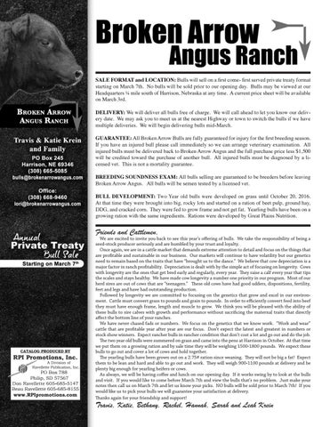 SALE FORMAT and LOCATION: Bulls will sell on a first come- first served private treaty format starting on March 7th. No bulls will be sold prior to our opening day. Bulls may be viewed at our Headquarters ¼ mile south of Harrison, Nebraska at any time. A current price sheet will be available on March 3rd. DELIVERY: We will deliver all bulls free of charge. We will call ahead to let you know our delivery date. We may ask you to meet us at the nearest Highway or town to switch the bulls if we have multiple deliveries. We will begin delivering bulls mid-March. GUARANTEE: All Broken Arrow Bulls are fully guaranteed for injury for the first breeding season. If you have an injured bull please call immediately so we can arrange veterinary examination. All injured bulls must be delivered back to Broken Arrow Angus and the full purchase price less $1,500 will be credited toward the purchase of another bull. All injured bulls must be diagnosed by a licensed vet. This is not a mortality guarantee. BREEDING SOUNDNESS EXAM: All bulls selling are guaranteed to be breeders before leaving Broken Arrow Angus. All bulls will be semen tested by a licensed vet. BULL DEVELOPMENT: Two Year old bulls were developed on grass until October 20, 2016. At that time they were brought into big, rocky lots and started on a ration of beet pulp, ground hay, DDG, and cracked corn. They were fed to grow frame and not get fat. Yearling bulls have been on a growing ration with the same ingredients. Rations were developed by Great Plains Nutrition.