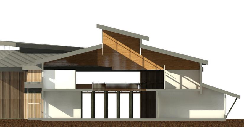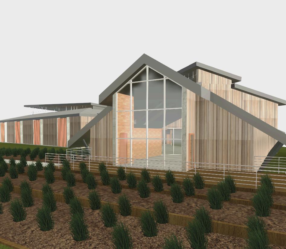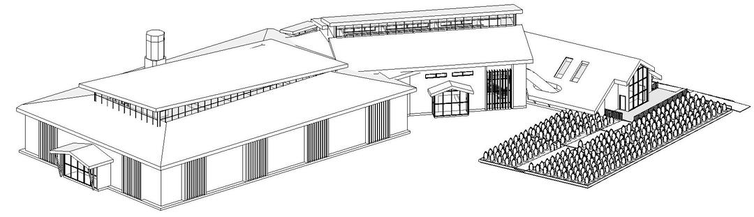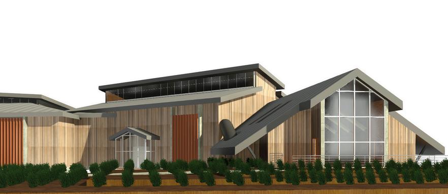 The Vineyard Community Center design celebrates the rich industrial and agricultural heritage of the area through the prominent roof slopes and elevation style akin to the Geneva company steel mill Design adheres to the wide angle formed by the intersection of roads at the site allowing three building sections to each skew at a unique angle. The building features several angles roof monitors and clerestory windows for natural lighting and thermal regulation while the sports complex includes an evaporative cooling tower for environmental control.