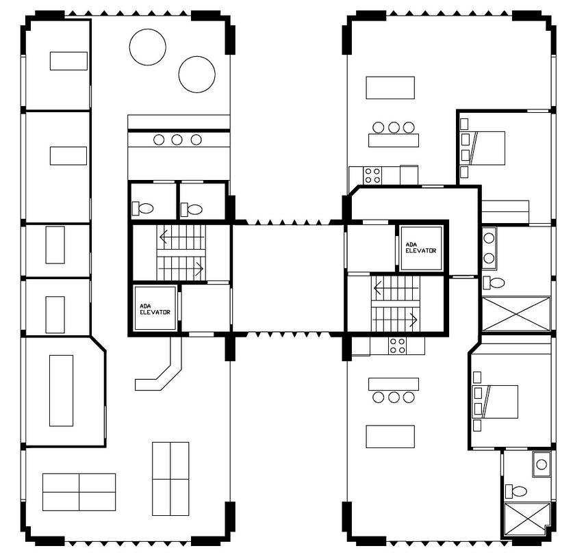 The tower features a classic art deco facade design inspired by the lines and patterns of golden age design prominent in the Golden Gate Bridge. Seismic resisting braces and frames line the exterior of each tower and are rigidly braced periodically at each abutting sky-bridge The west tower features spaces designed for commercial occupants while the east tower houses residential spaces and light retail spaces occupy each sky-bridge.