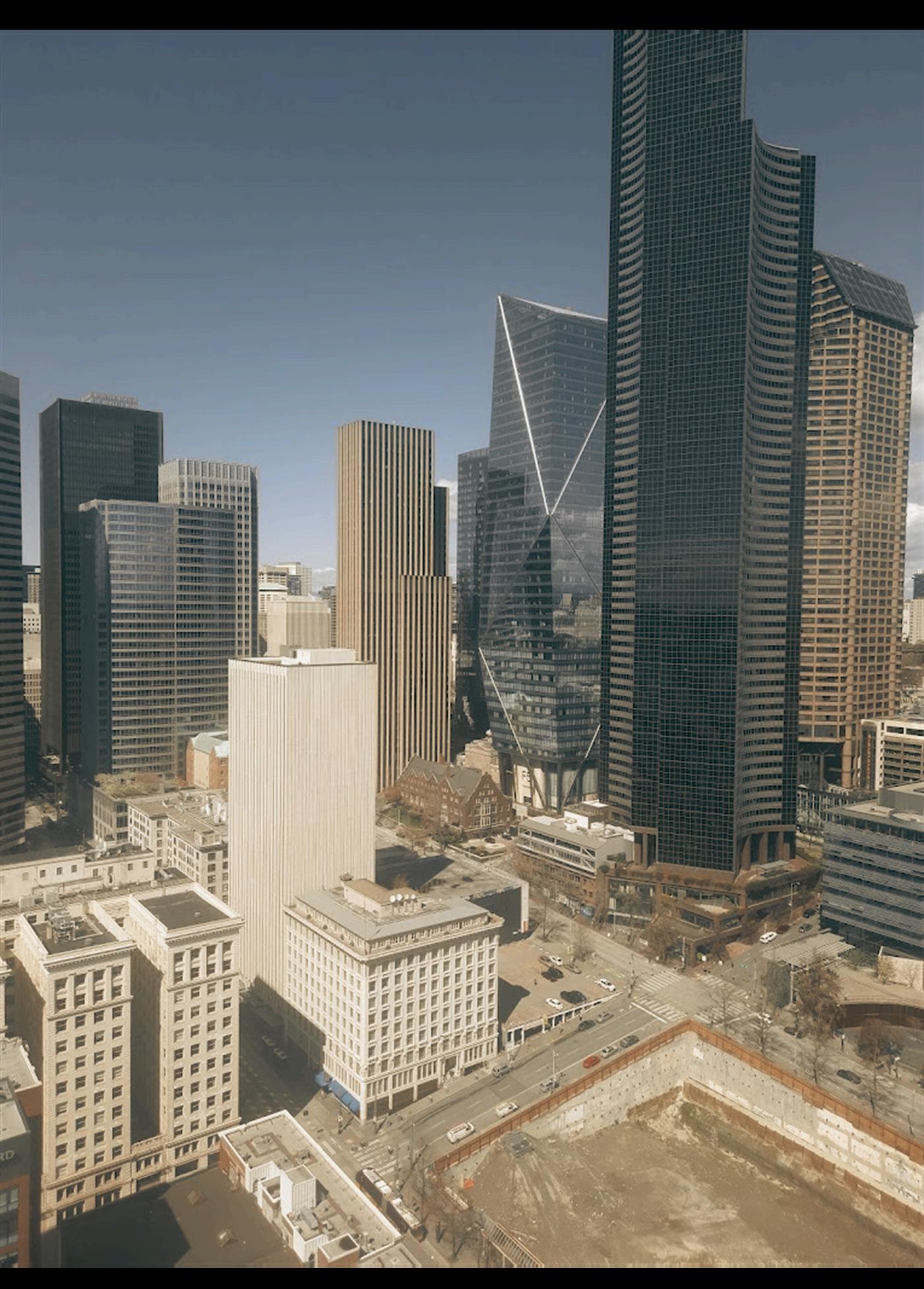 The tower features a clean facade design inspired by the lines and colors of new age design prominent in the space needle and projects of the 2040 district. Seismic resisting shell sits at the exterior of the tower footprint and intersects the volumes as the building height and area increase. Building facade promotes high-performance design through solar shade fins and mesh solar shades for energy efficiency as well as rainwater harvesting