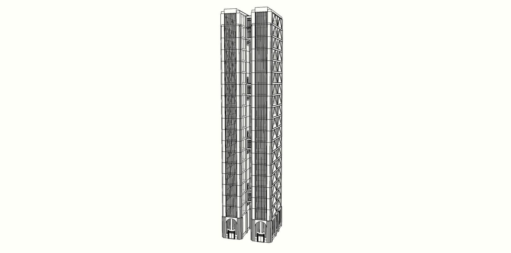 Students design a 19-story tall tower with unique plan and elevation constraints. Building form design criteria required two identical towers connected periodically by sky-bridges at varying elevations. Building design also needed to conceal a structural system capable of resisting high seismic loads while still maximizing rentable floor area