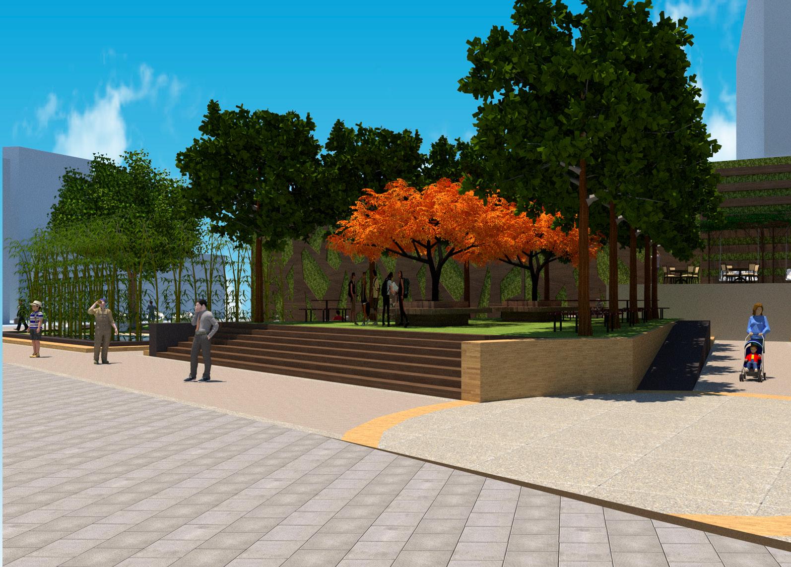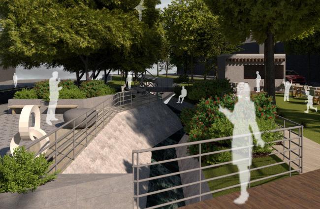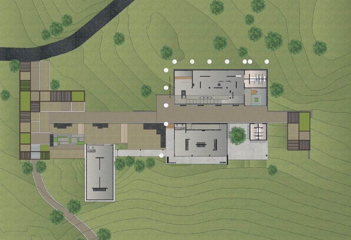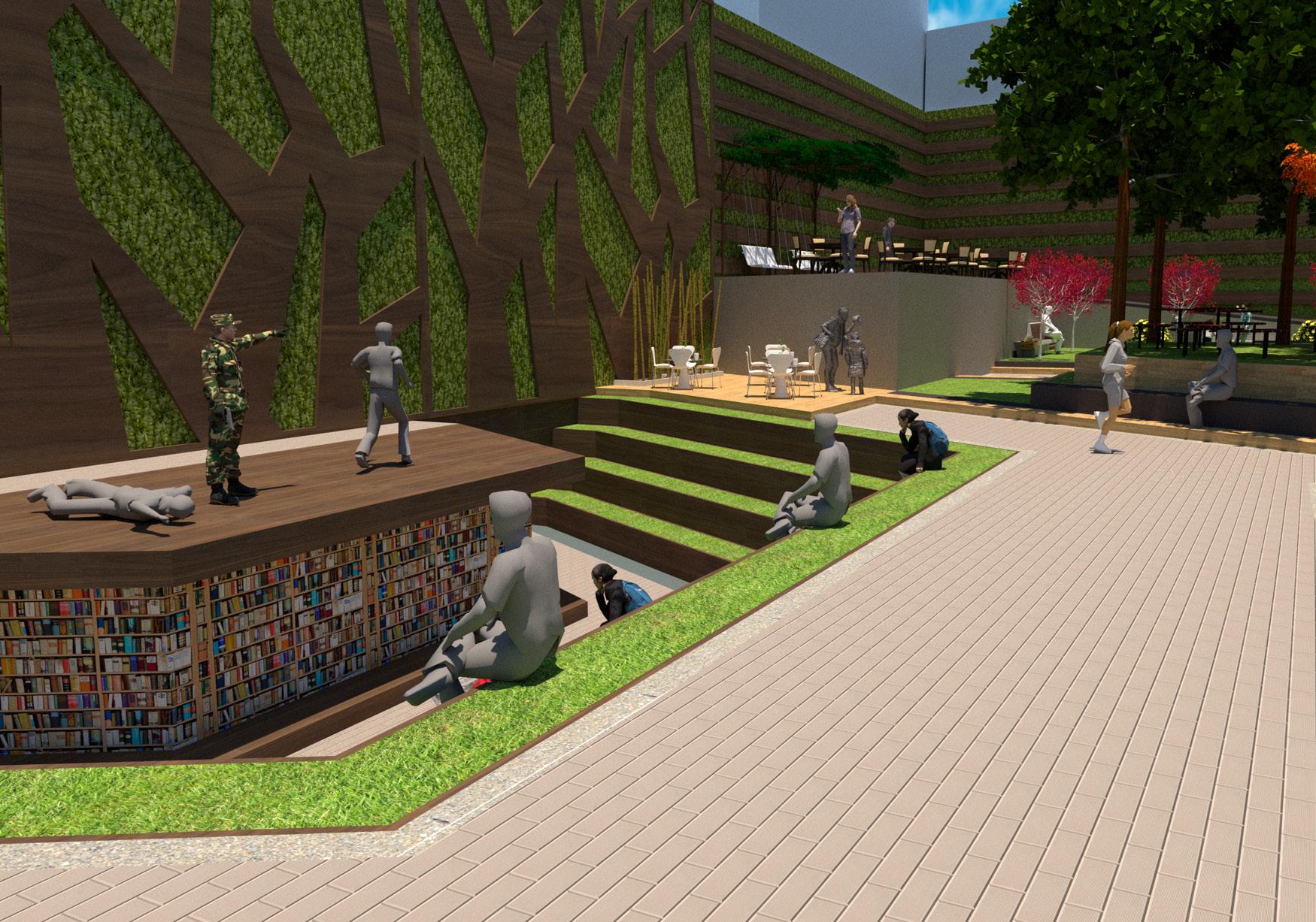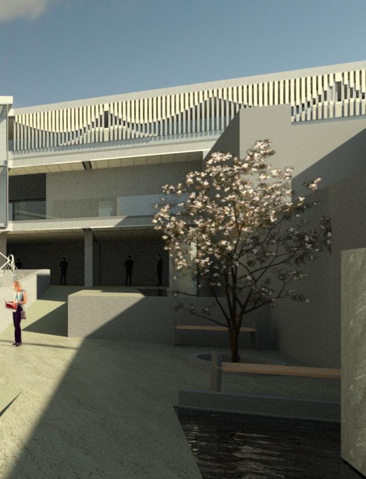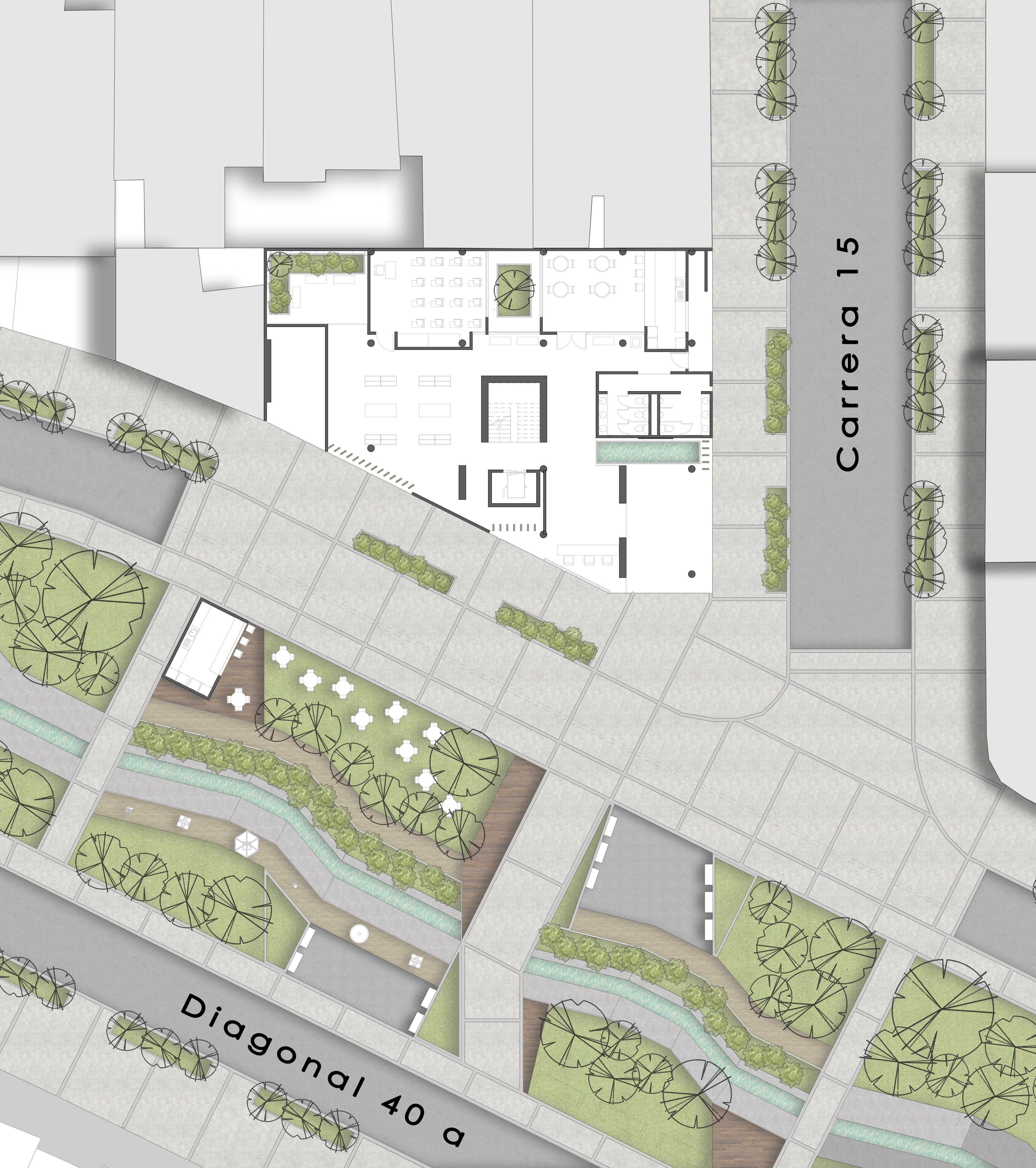 Acompañando el volumen arquitectónico, se genera un espacio urbano utilizando el canal del rio arzobispo, como un eje de diseño tanto espacial como paisajístico, donde las plazas, espacios de permanencia y recorridos se relacionan con la dinámica de la escuela de artes.