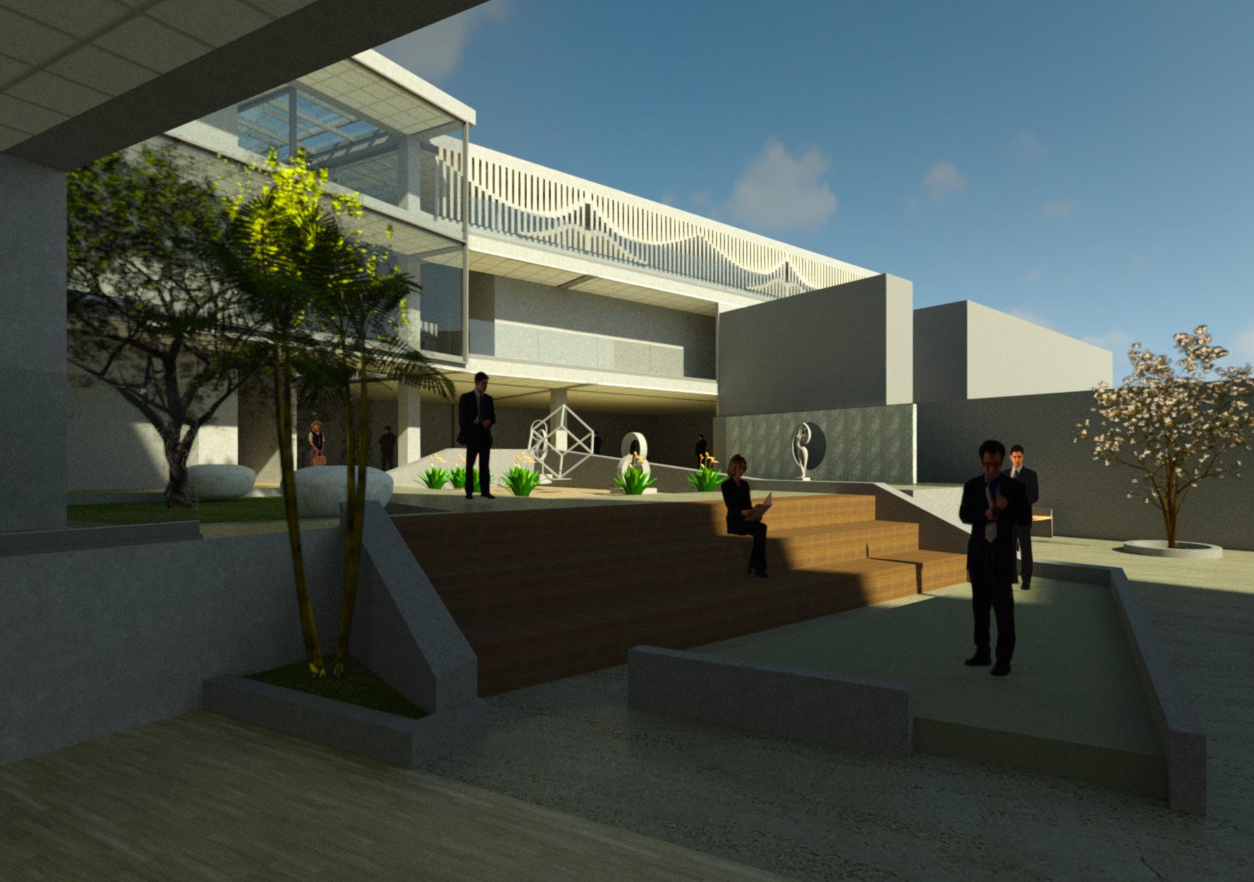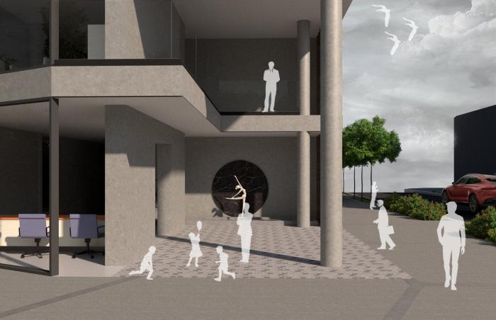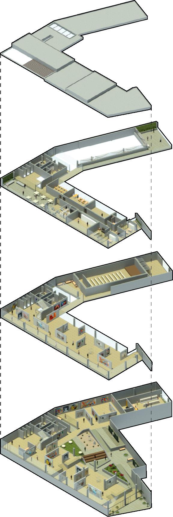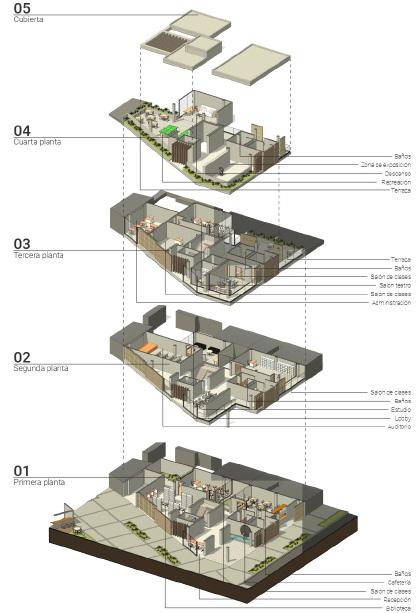En temas de composición, este se da mediante diversas sustracciones que permiten ajustar este a la normativa del sector, por lo tanto, el gran vacío interior se da gracias a la unión de tres aislamientos y una sustracción, esto para dar paso a la creación de una plaza interior con diferentes niveles aprovechando la topografía del terreno, estas sustracciones también permiten Generar terrazas en el último nivel, y una plaza de recibimiento que se complementa como un punto de encuentro o de referencia para el transeúnte, además de ayudar a ajustar la forma distorsionada del volumen.