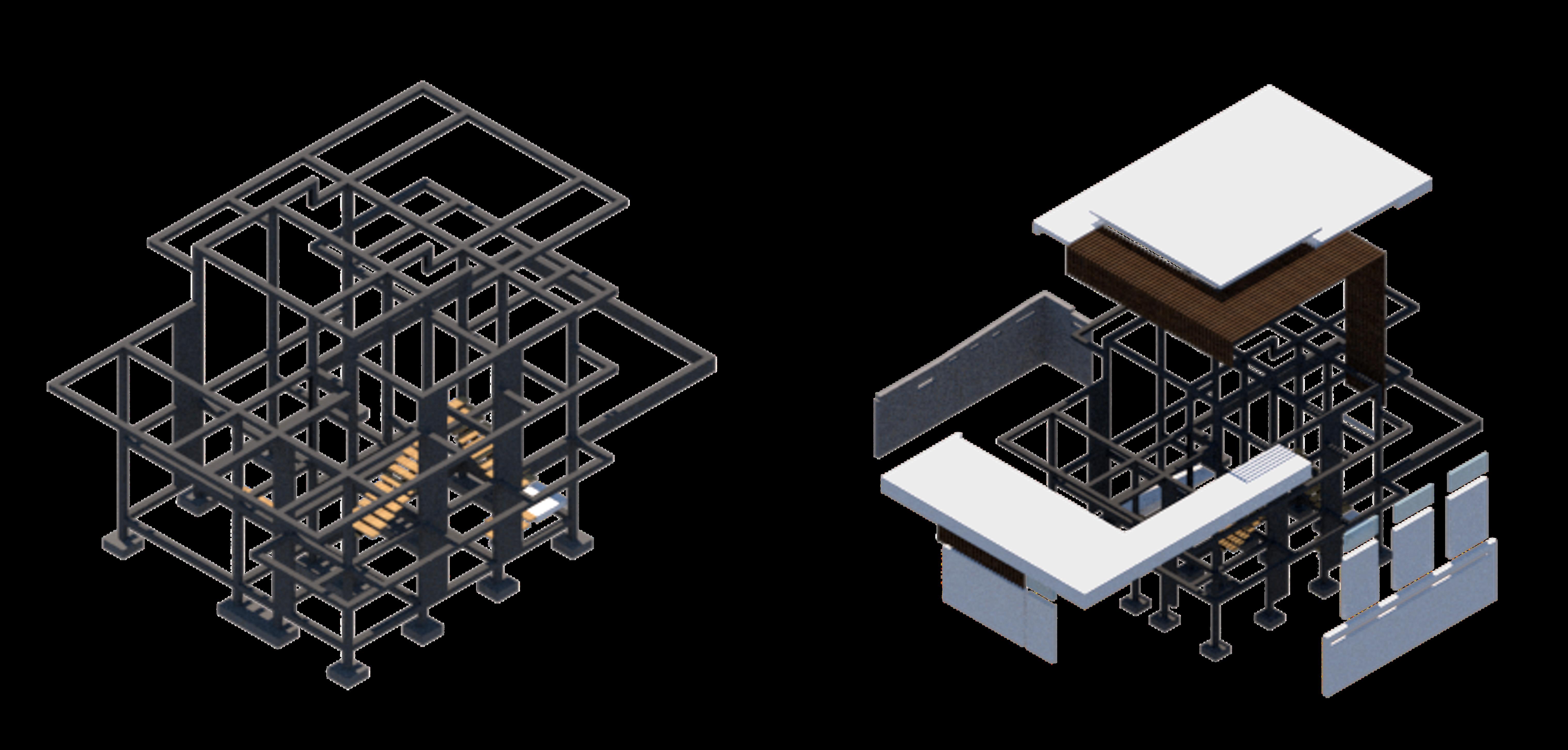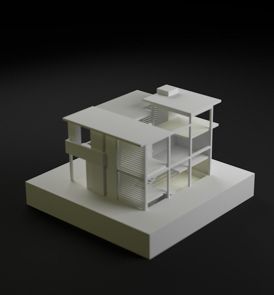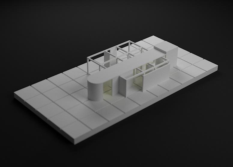 Para el concepto se utiliza un volumen y un plano que funcionan como punto y contra punto respectivamente, generando de esta manera un espacio lineal que organiza, articula y regula en una dirección especifica la composición, en la cual ademas se articulan varios elementos como planos opacos y translucidos con aberturas que permitan la circulación a través de estos permitiendo así la conexión de varios espacios.