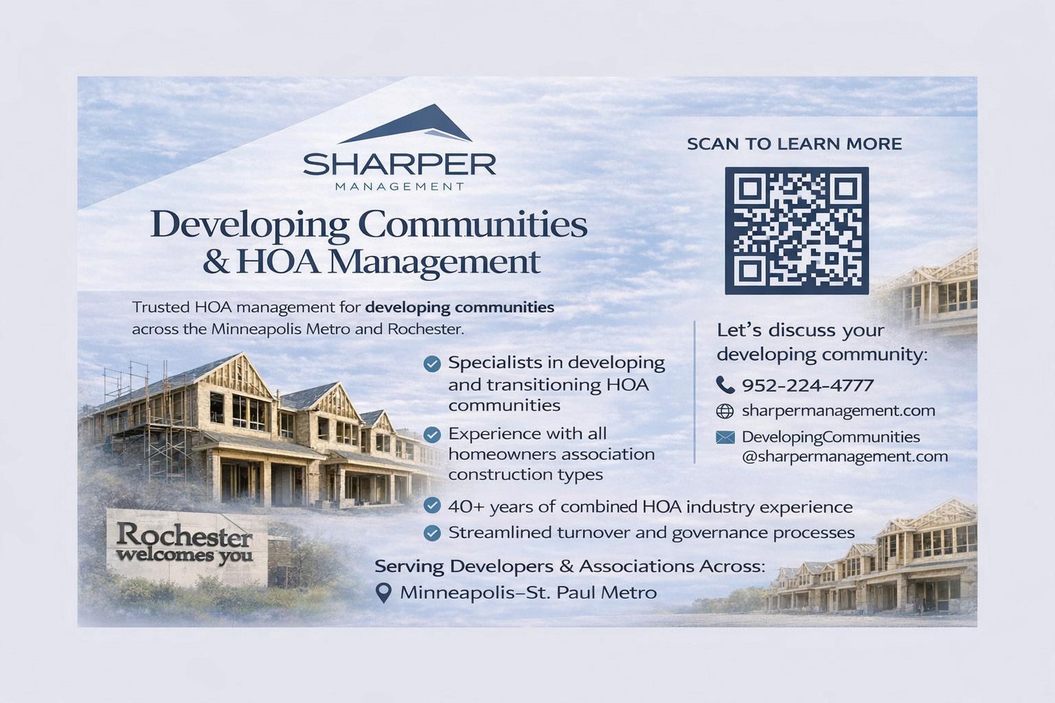 Established in 2009, Sharper Management is a locally-owned property management company serving all types of residential homeowner associations in Minnesota. Our commitment to being Your Minnesota Neighbor defines who we are and how we serve our clients and community.We currently employ over 60-full time staff members in our offices in Eden Prairie, Maple Grove and Woodbury. We serve over 300 total communities from Watertown to Stillwater and Hugo to Northfield. We manage all types of HOAs from small 6-unit condo buildings, to large 600-unit townhome developments, to expansive single-family communities with multiple phases and amenities.
