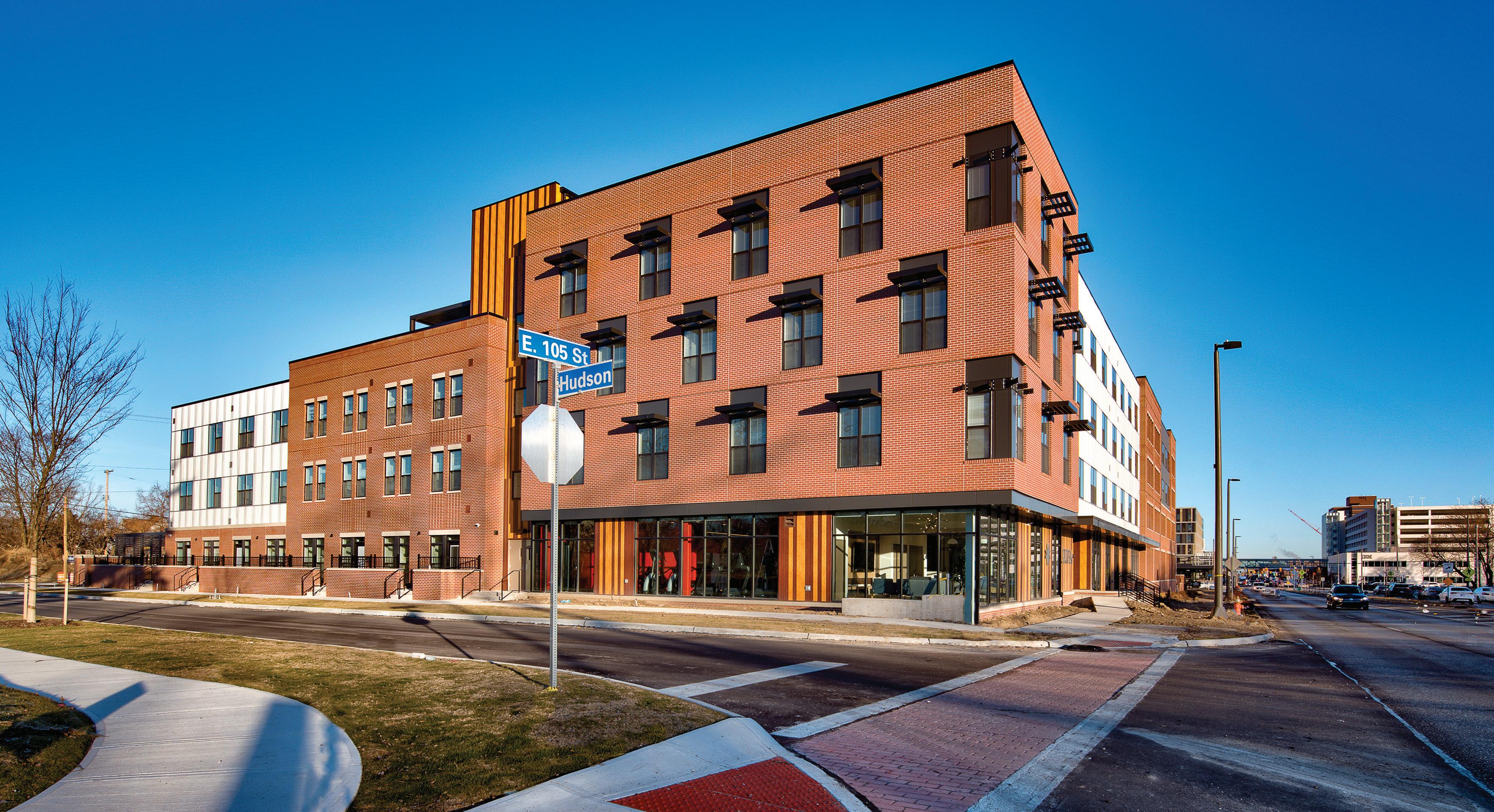 Just south of the sprawling Cleveland Clinic campus, Aura at Innovation Square offers mixedmarket housing options that will appeal to a wide range of residents. This 80,000-square-foot, four-story building is located on one and one-half acres at 2260 E. 105th St., right where East 105th meets Opportunity Corridor.