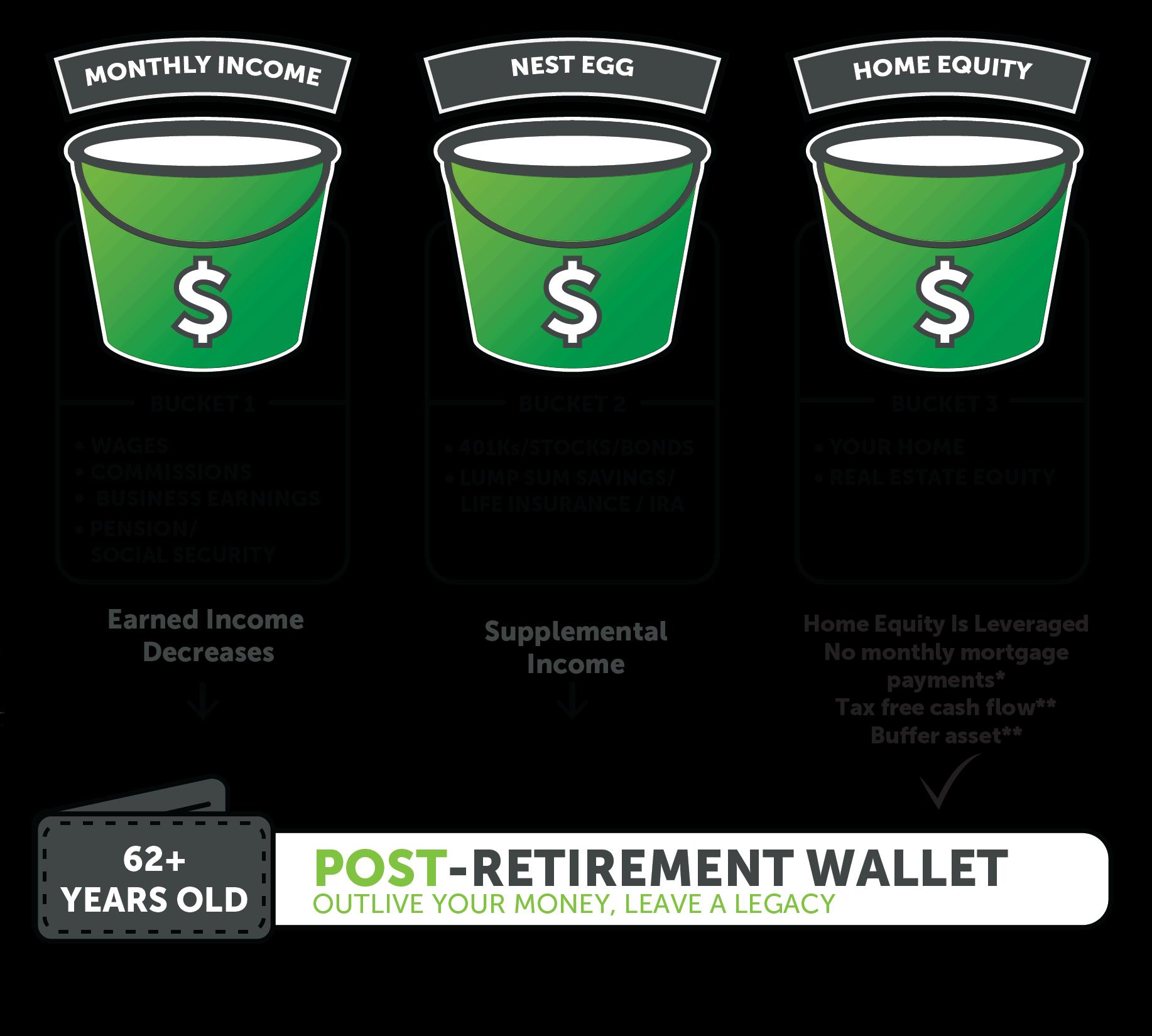 • Refi example: client wants to draw SSI in 5 years. Wife wants to retire now. Set up a line of credit now that will allow up to $2900/month in additional income until SSI starts. Wife can now retire 5 years early.
