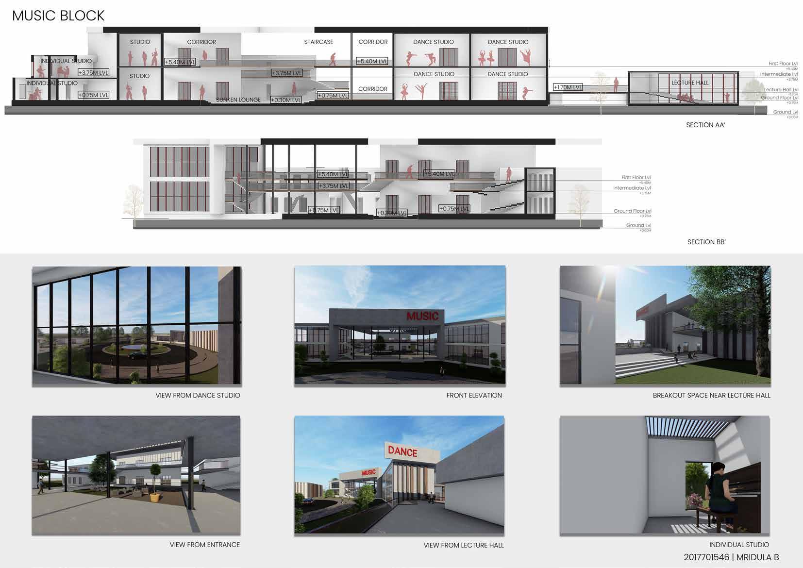 Music is defined as the art of sound in time whereas architecture is the art of play between form and space. Since music belongs to the aural field and architecture belongs to the visual field, the intent is to create a music conservatory with a conjunctural approach.