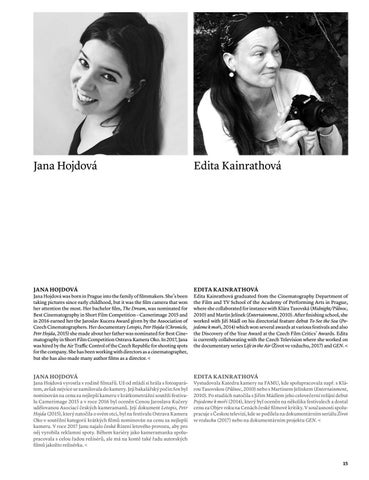 Jana Hojdová was born in Prague into the family of filmmakers. She’s been taking pictures since early childhood, but it was the film camera that won her attention the most. Her bachelor film, The Dream, was nominated for Best Cinematography in Short Film Competition – Camerimage 2015 and in 2016 earned her the Jaroslav Kucera Award given by the Association of Czech Cinematographers. Her documentary Letopis, Petr Hojda (Chronicle, Petr Hojda, 2015) she made about her father was nominated for Best Cinematography in Short Film Competition Ostrava Kamera Oko. In 2017, Jana was hired by the Air Traffic Control of the Czech Republic for shooting spots for the company. She has been working with directors as a cinematographer, but she has also made many author films as a director. <