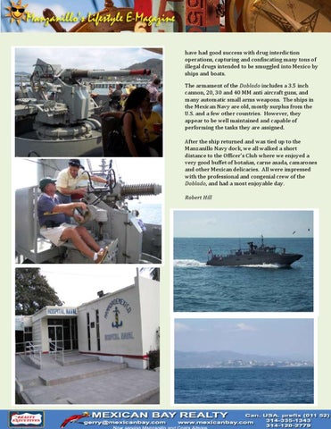 have had good success with drug interdiction operations, capturing and confiscating many tons of illegal drugs intended to be smuggled into Mexico by ships and boats. The armament of the Doblado includes a 3.5 inch cannon, 20, 30 and 40 MM anti aircraft guns, and many automatic small arms weapons. The ships in the Mexican Navy are old, mostly surplus from the U.S. and a few other countries. However, they appear to be well maintained and capable of performing the tasks they are assigned. After the ship returned and was tied up to the Manzanillo Navy dock, we all walked a short distance to the Officer’s Club where we enjoyed a very good buffet of botaùas, carne asada, camarones and other Mexican delicacies. All were impressed with the professional and congenial crew of the Doblado, and had a most enjoyable day. Robert Hill